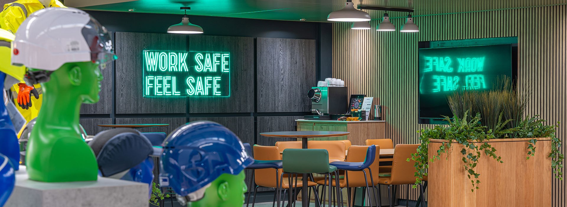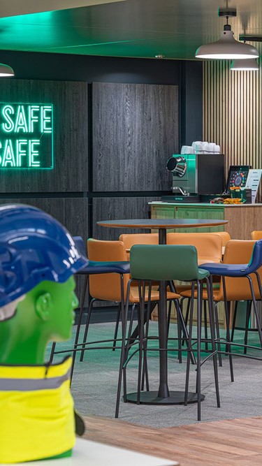 The spacious, brightly lit Lyreco showroom features painted colour blocking details on the walls that pull their recognisable brand colours throughout the space. We created two informal break-out meeting areas, as well as a more formal conference room with a media wall and large central table. These meeting areas also serve to showcase new furniture products available from Lyreco. There is also new industrial-inspired display units with concrete effect finishes and metal key clamp detailing to display Lyreco's products at varying heights.