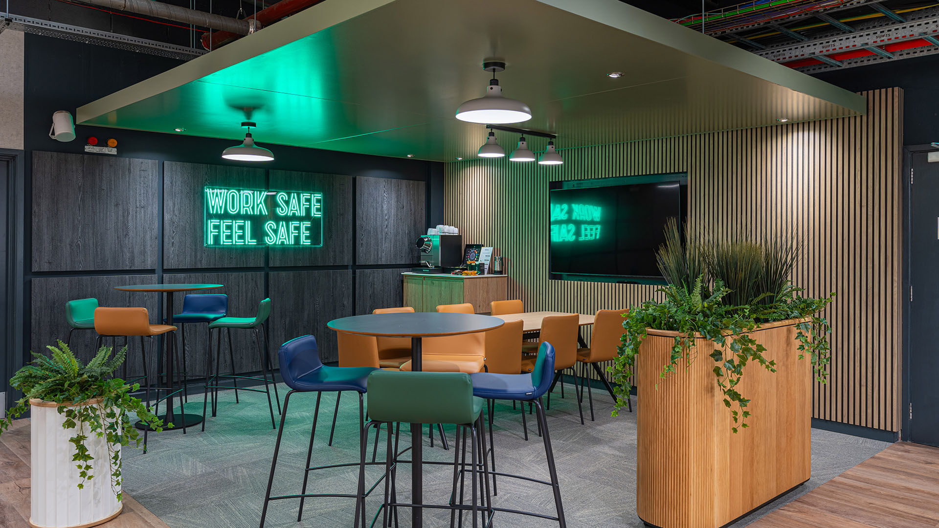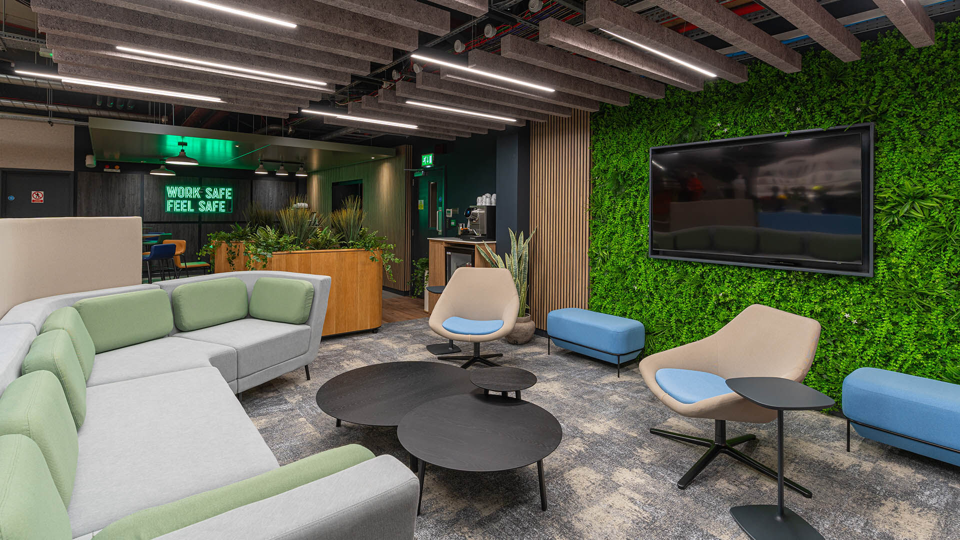 This revolutionary new showroom features two informal break-out meeting areas, as well as a more formal conference room with a media wall and large central table. Each meeting area has its own bespoke features, including drinks stations, faux planting and even a green wall to bring softness to this industrial scheme.