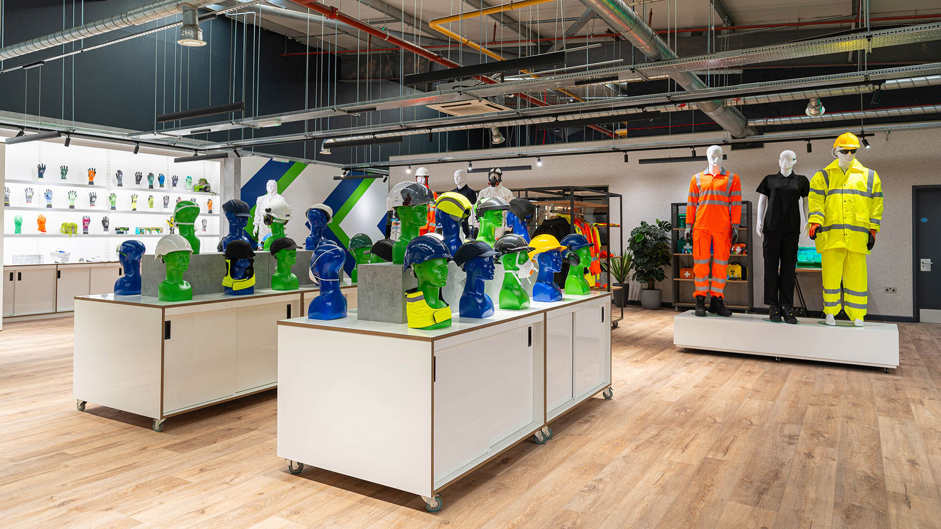 These meeting areas also serve to showcase new furniture products available from Lyreco. Feature lighting has been used to help zone these spaces as separate entities from the main showroom, and a green neon light proudly displays Lyreco’s motto. Painted colour blocking details to the walls and display units pull through their recognisable brand colours. The spacious, brightly lit showroom area houses new industrial-inspired display units with concrete effect finishes and metal key clamp detailing to display Lyrecos products at varying heights.