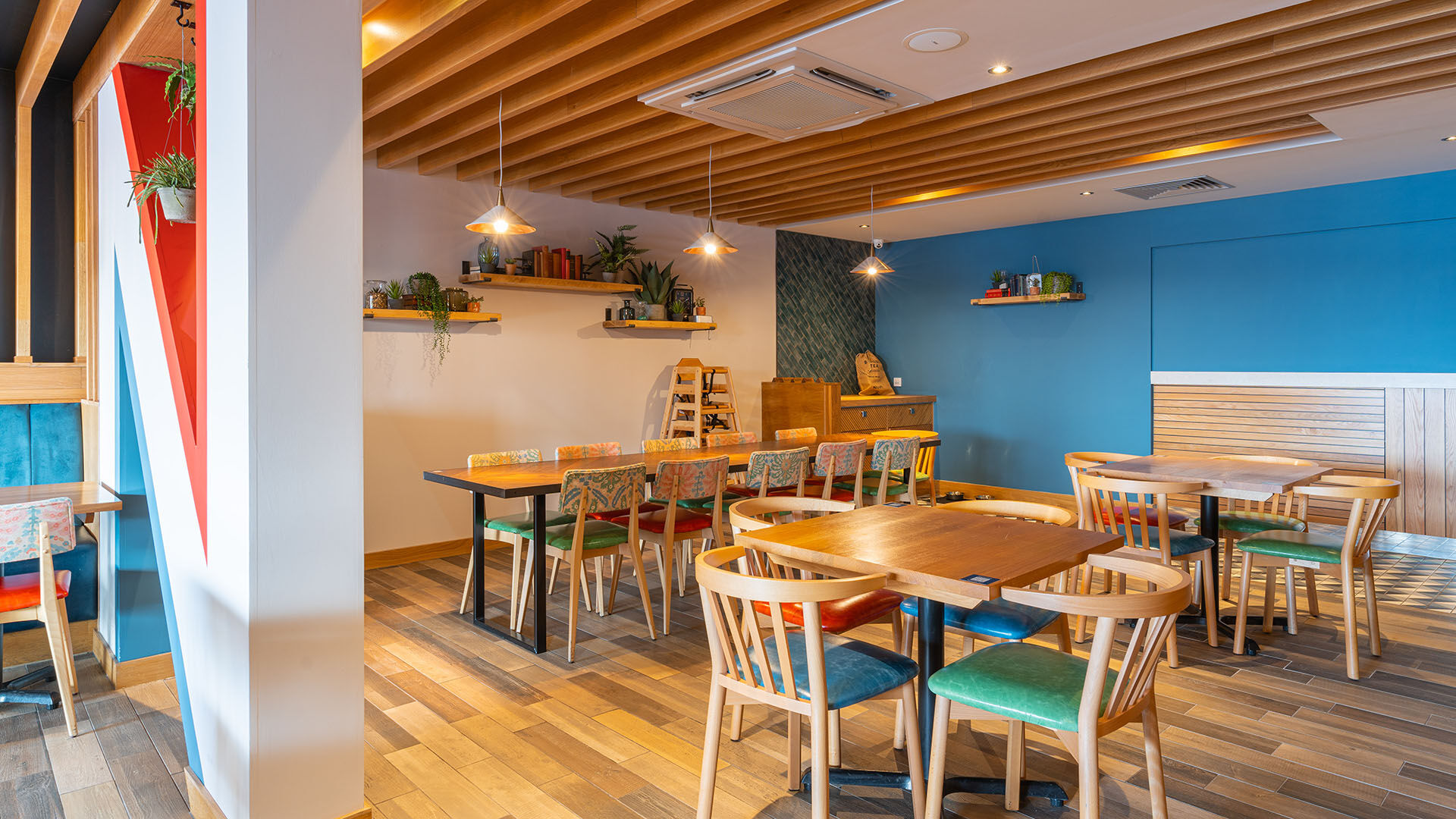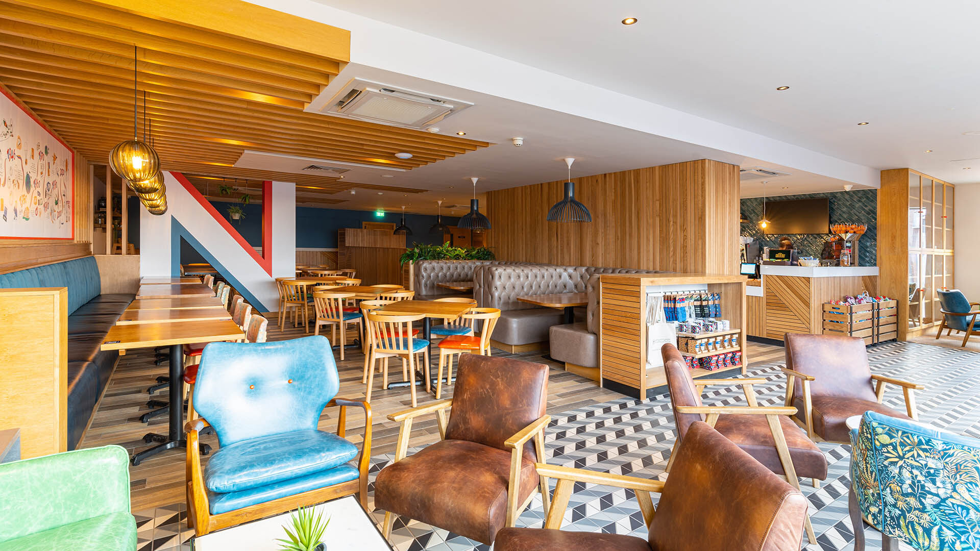 Furniture styles vary throughout – we reupholstered some existing dining chairs for re-use whilst supplementing with a mix of lounge chair styles to sit nicely with new coffee tables. We reused large sections of fixed seating from the existing site and reupholstered the long run in a dark blue leather to fit with the new branding.