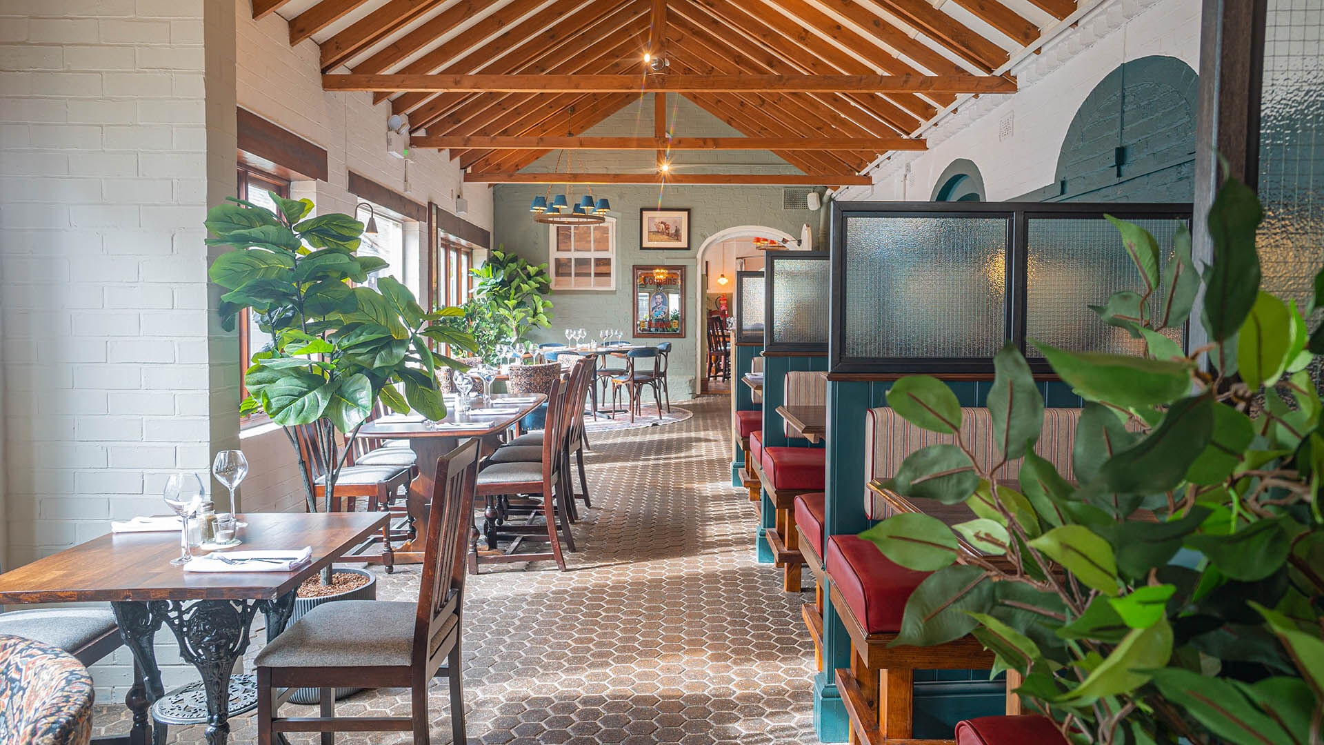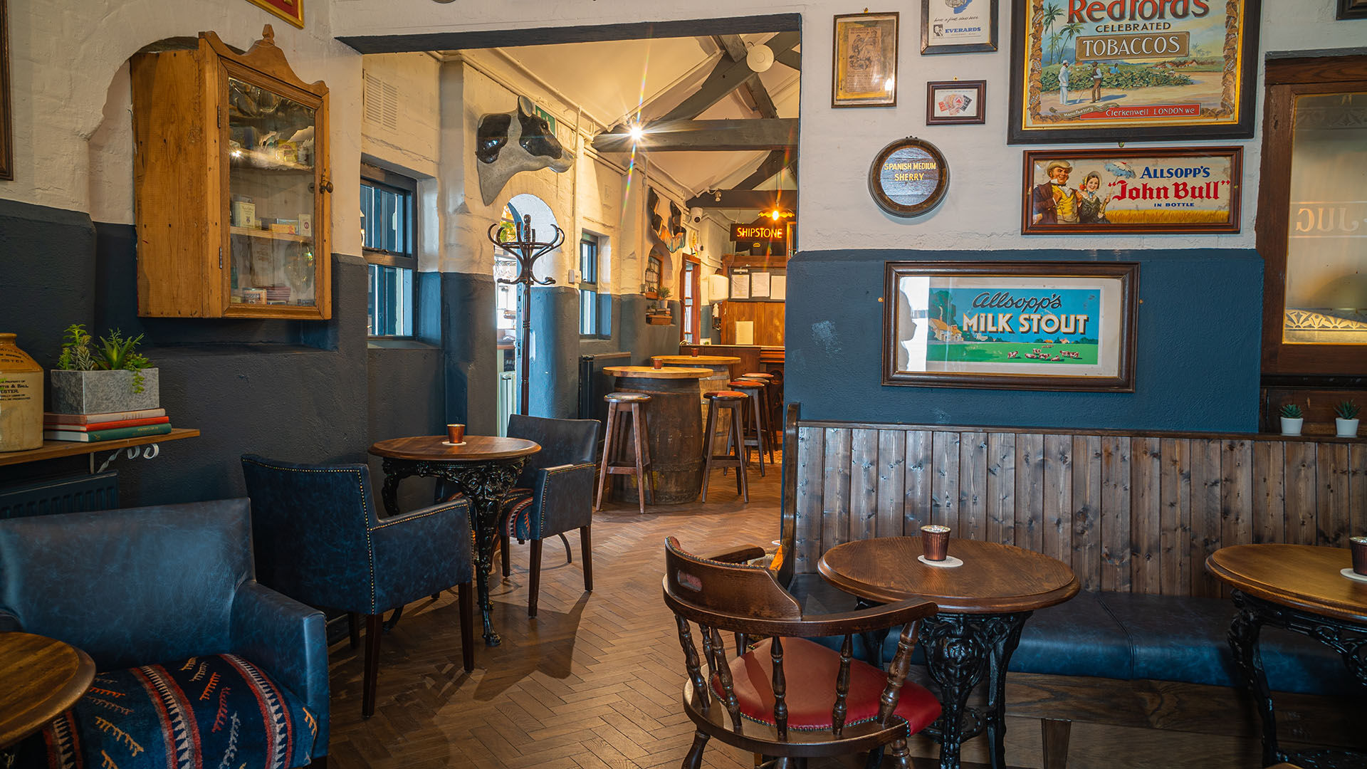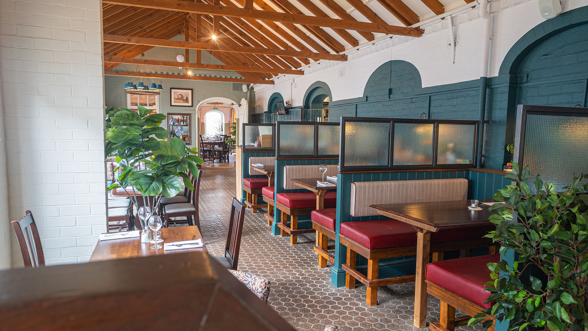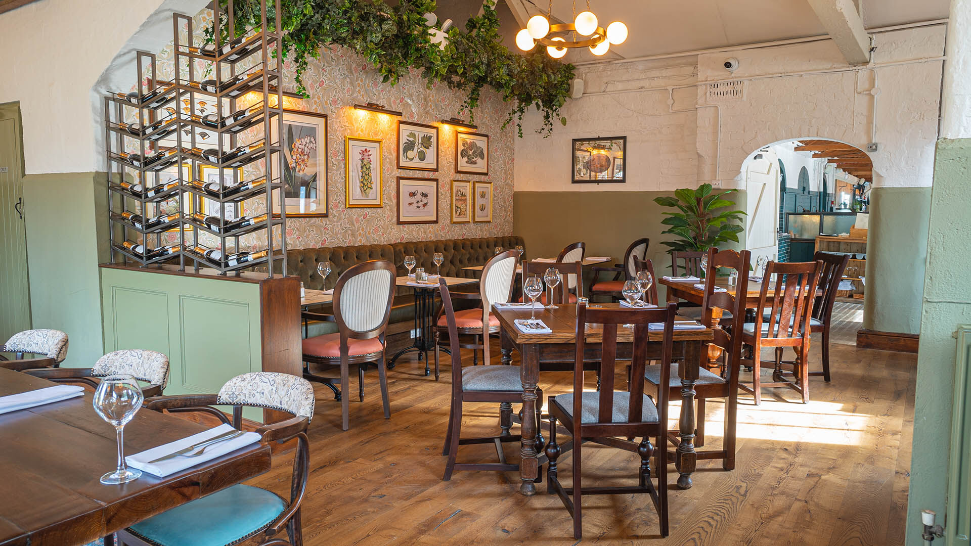 The Cow & Plough has been described as having an upmarket, brasserie feel", with fixed seating, a larger bar and a new private dining area. We introduced a new parquet floor, tiled bar apron, warmer colours, log burner and all new furniture throughout including rugs and sofas. Moodier colours, rich colour palettes, velvets and leather.