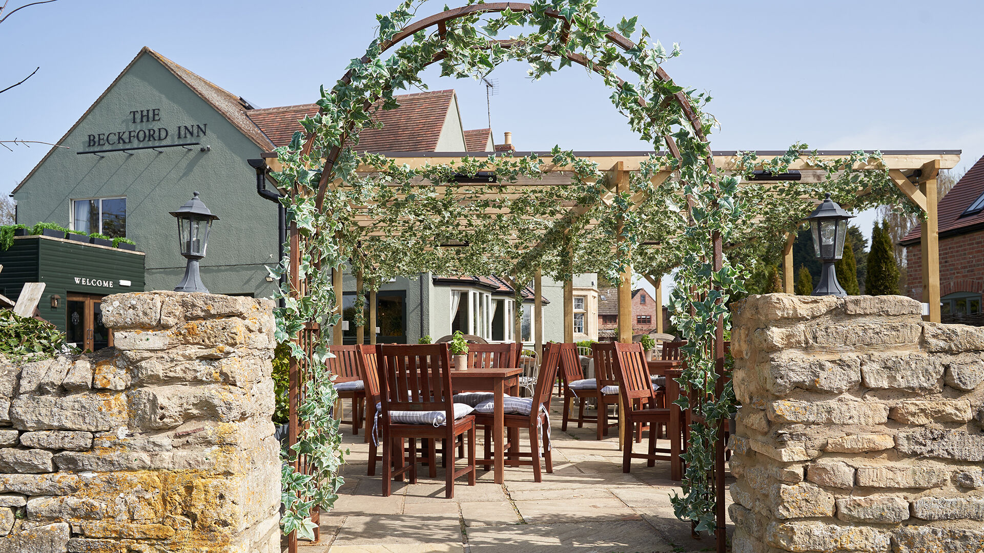 The Beckford Inn is a beautiful, newly refurbished 19th-century Cotswold pub and hotel near Tewkesbury. You will find a spacious beer garden and heated pergola terrace next to a beautiful garden marquee, perfect for inside-outside drinks, meals, and events also on the property.