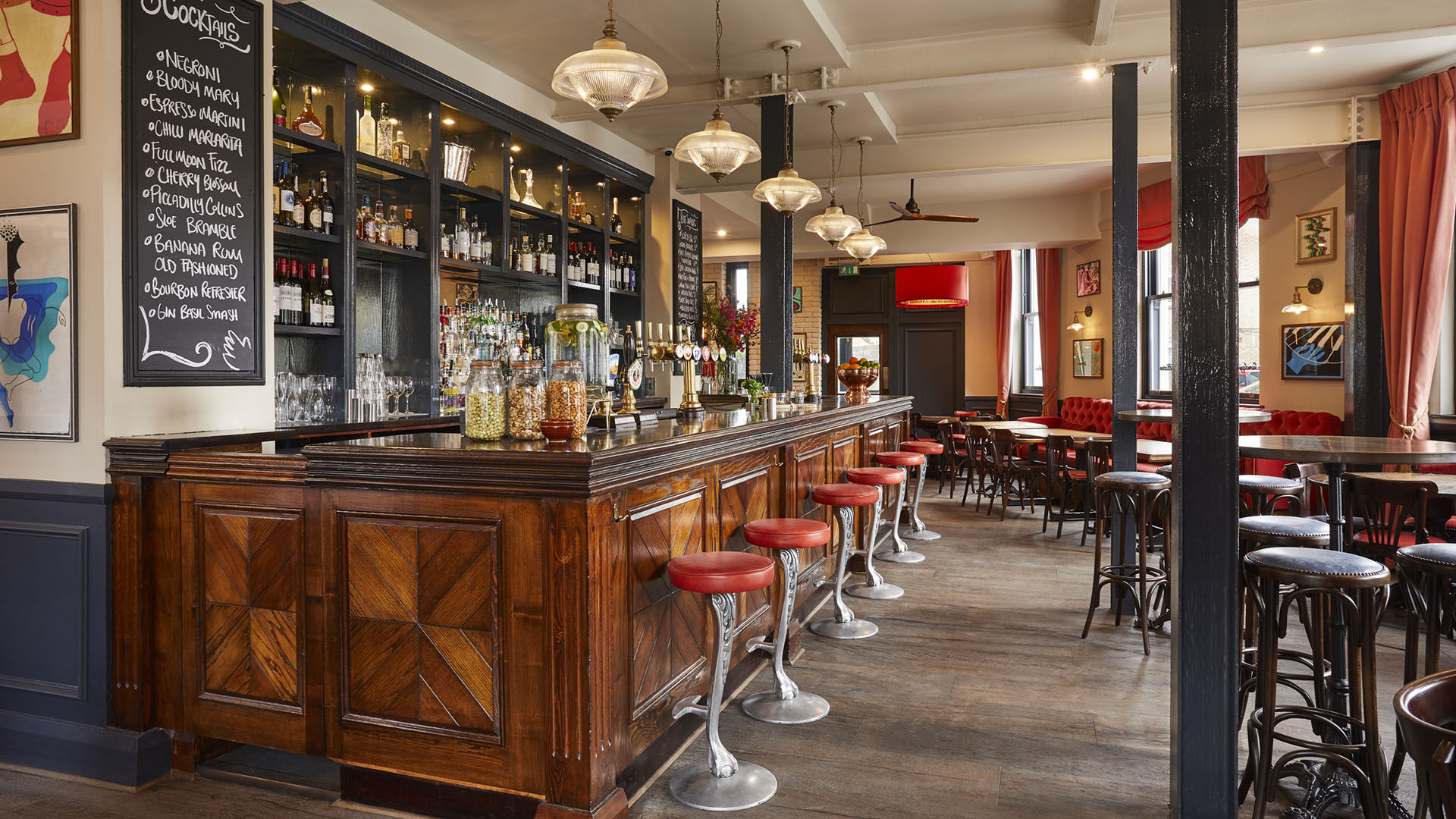 The Stonhouse's interior decorative style is characterised by an eclectic mix of imitative historic and abstract artwork combined with vibrant shapes and colours that draw the eye. Bright red fixed seating, light shades, barstools, and dining chairs combined with splashes of deep navy or turquoise is loud yet sophisticated.