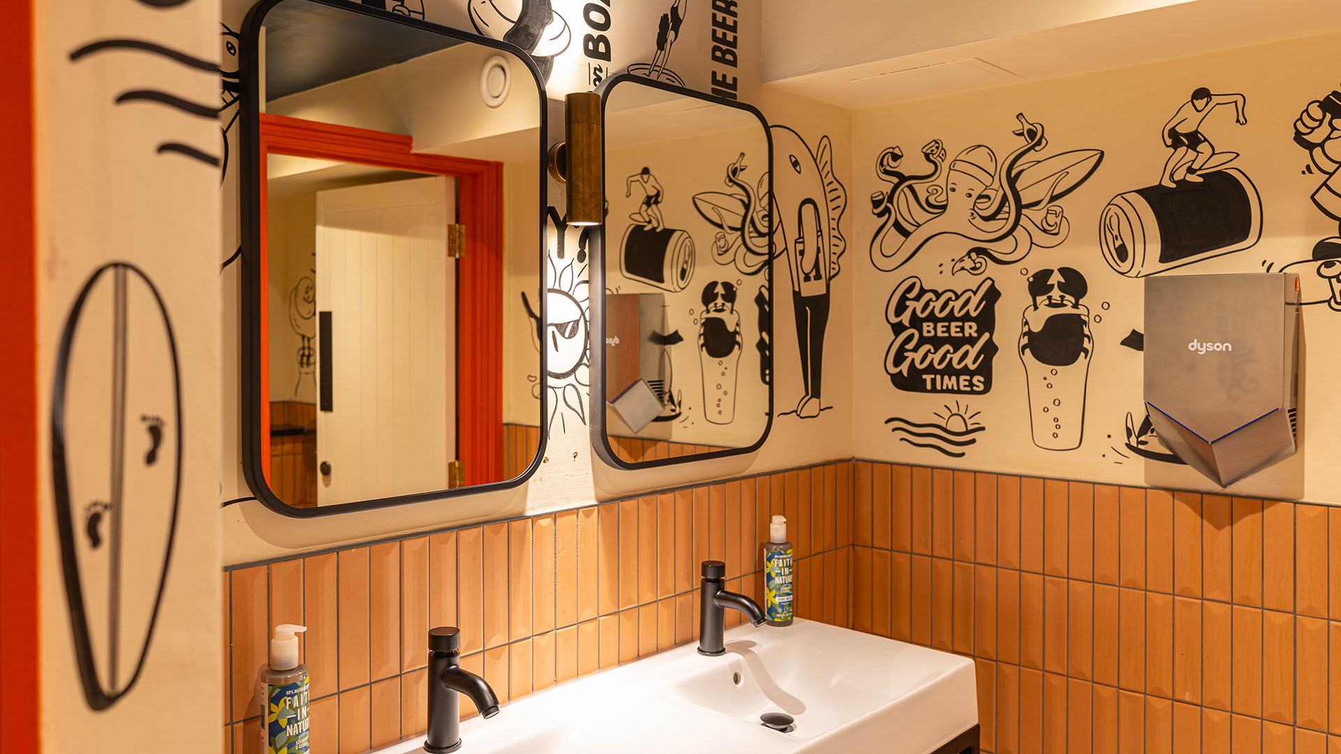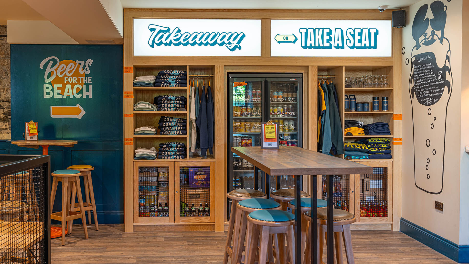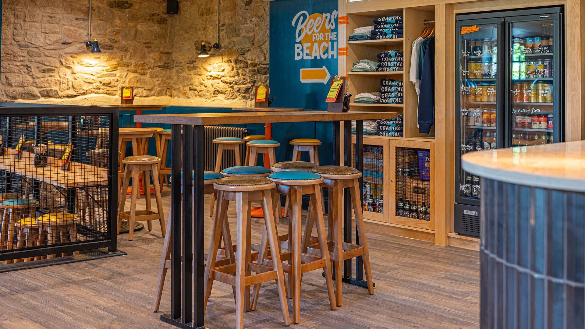 This innovative space boasts a range of distinct features, including striking wall art that infuses the venue with a unique and lively ambience. This jovial and doodle-like artwork even follows you into the toilets! There is also a shop area offering an array of branded clothing for customers to browse and purchase. Guests are encouraged taste new and exclusive beers from Harbour Brewing Co, alongside their much-loved favourites and limited-edition cask specials from St Austell Brewery.