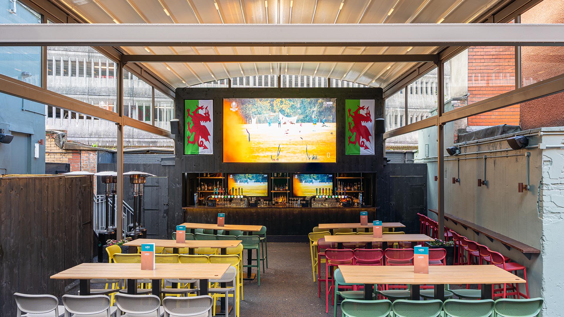 At the heart of the venue is a state-of-the-art beer garden with its own outdoor bar, ensuring you never miss a moment of the action on the big screens. Featuring Cardiff’s largest outdoor UHD wall screen and a fully retractable roof, the covered outdoor area keeps the fun going whatever the weather, all year round.