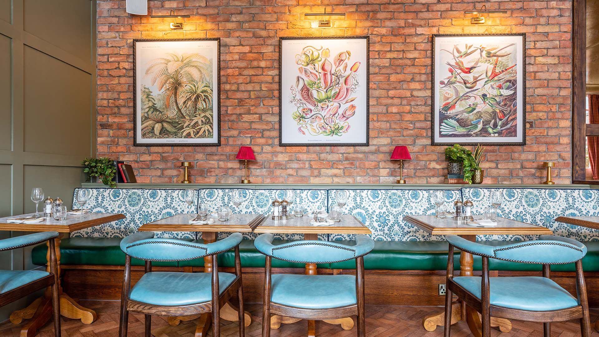 Exposed bricks contrast against feature planting and the brass bar top, alongside the continuation of floral prints. Bookable booths have been added alongside sections of comfortable fixed seating, with a mixture of modern furniture in velvets and leather. Simple globe lighting has been used throughout with an abundance of natural light also spilling in from the existing windows, new patio doors and roof lantern. The new roof lantern is adorned with planting which alludes to an orangery style atmosphere.