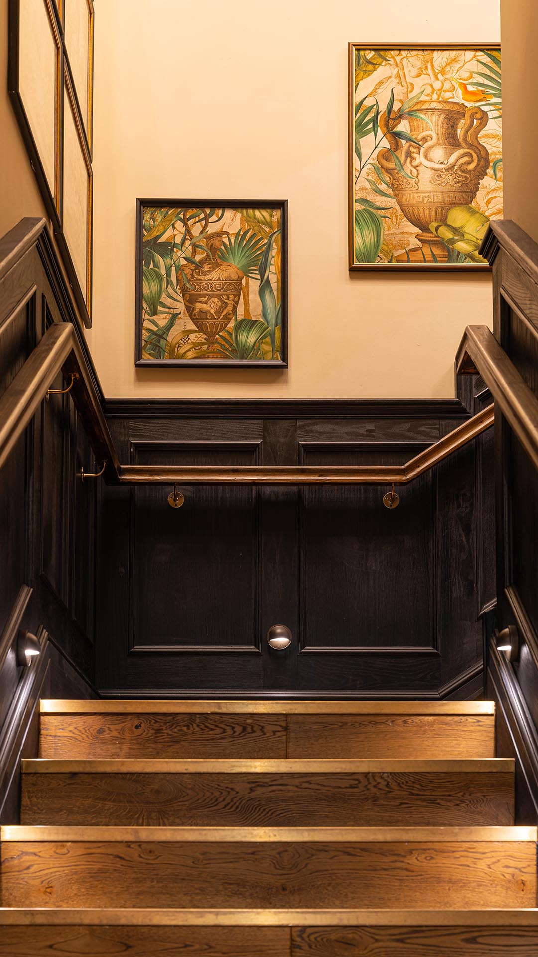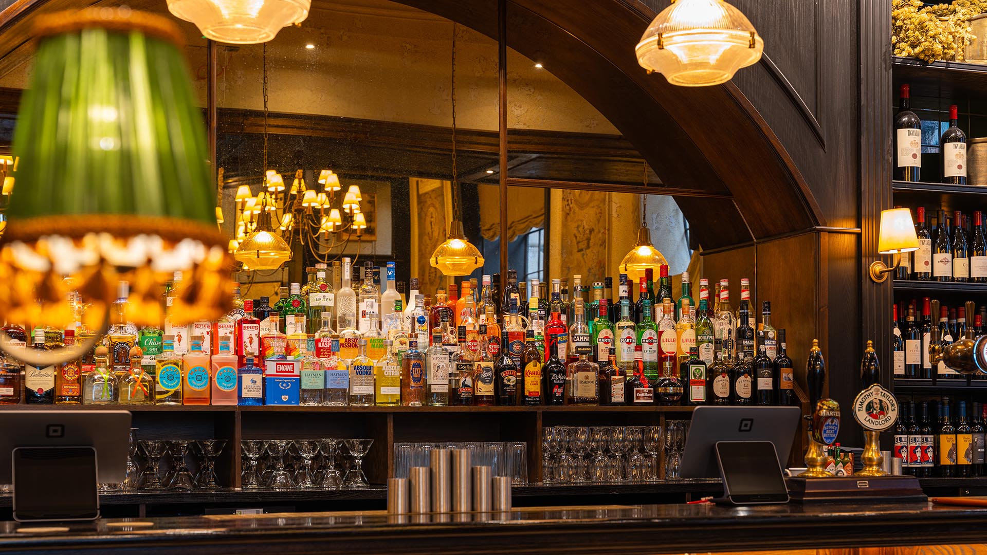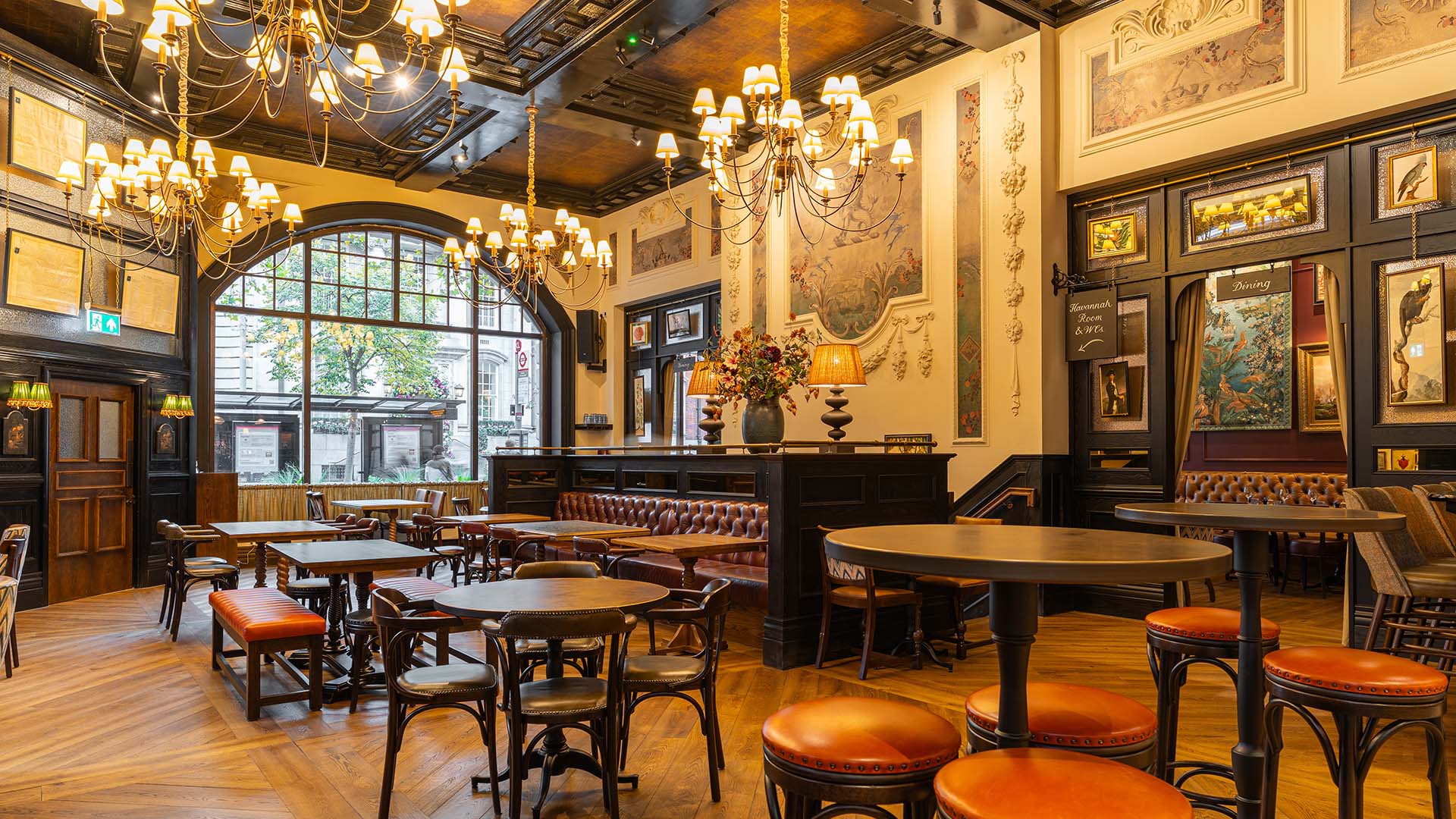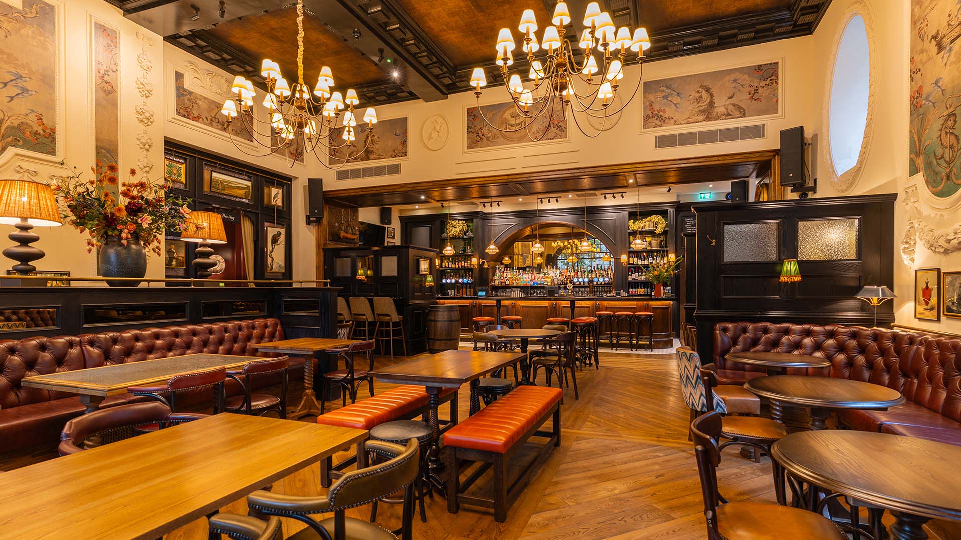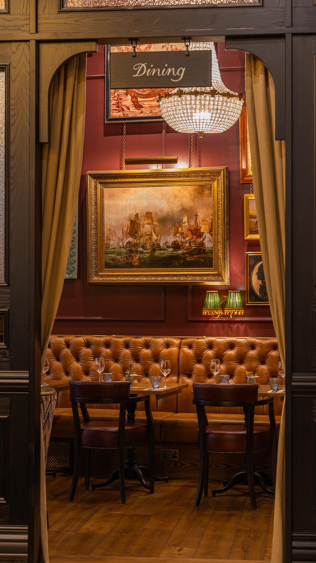 Named after one of Britain’s most decisive victories, The Trafalgar spans two floors. Guests enter through the lobby into the Old Banking Hall, where five-metre-high aged bronze ceilings, four chandeliers and bespoke wallpaper framed by original festoon plasterwork set the tone. Vintage art, original paperwork and oversized lamps create an elegant and timeless atmosphere, while restored Georgian windows and ornate plasterwork blend seamlessly with a warm new interior featuring an impressive bar, intimate booths, leather dining chairs and statement chandeliers.