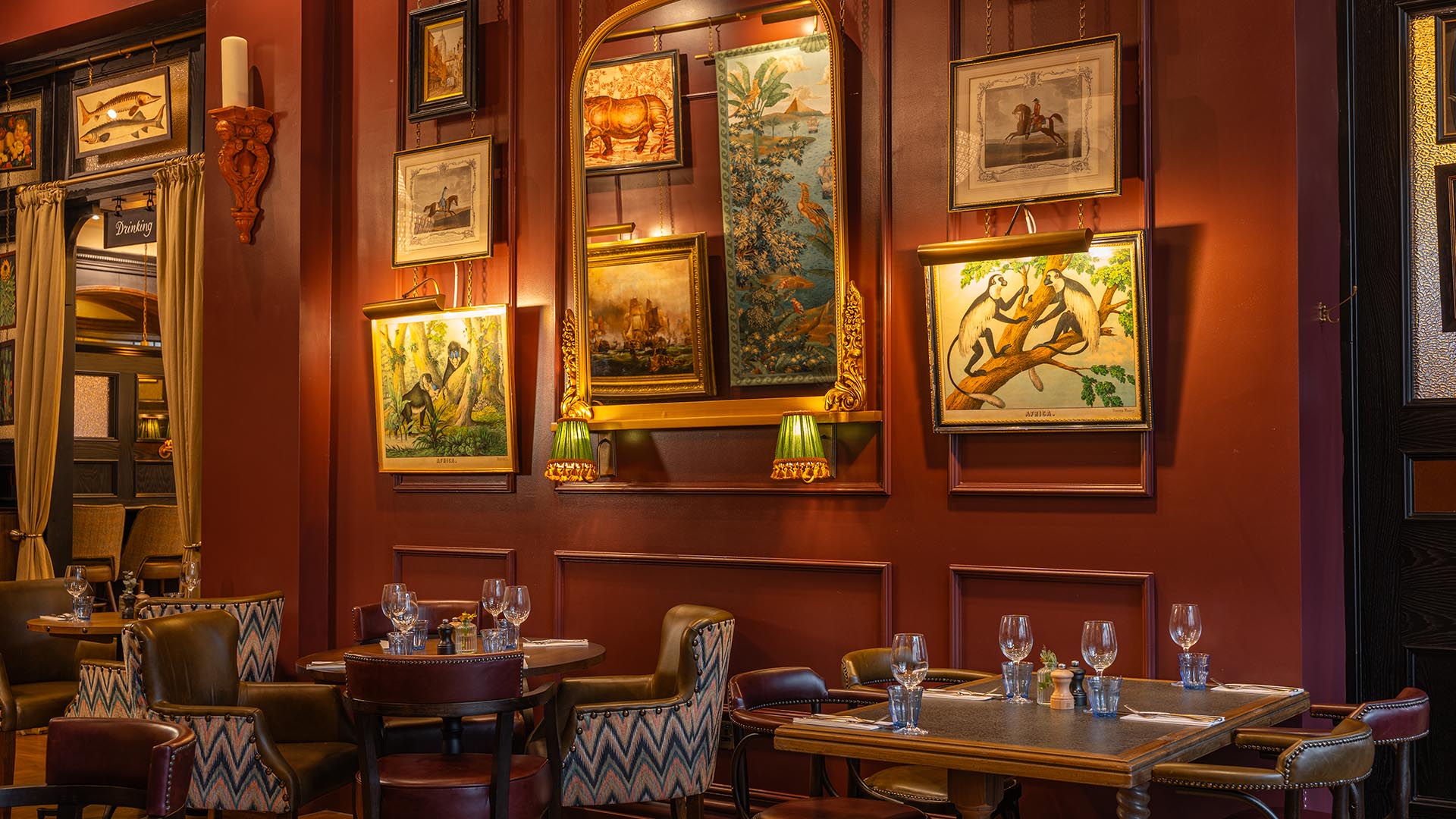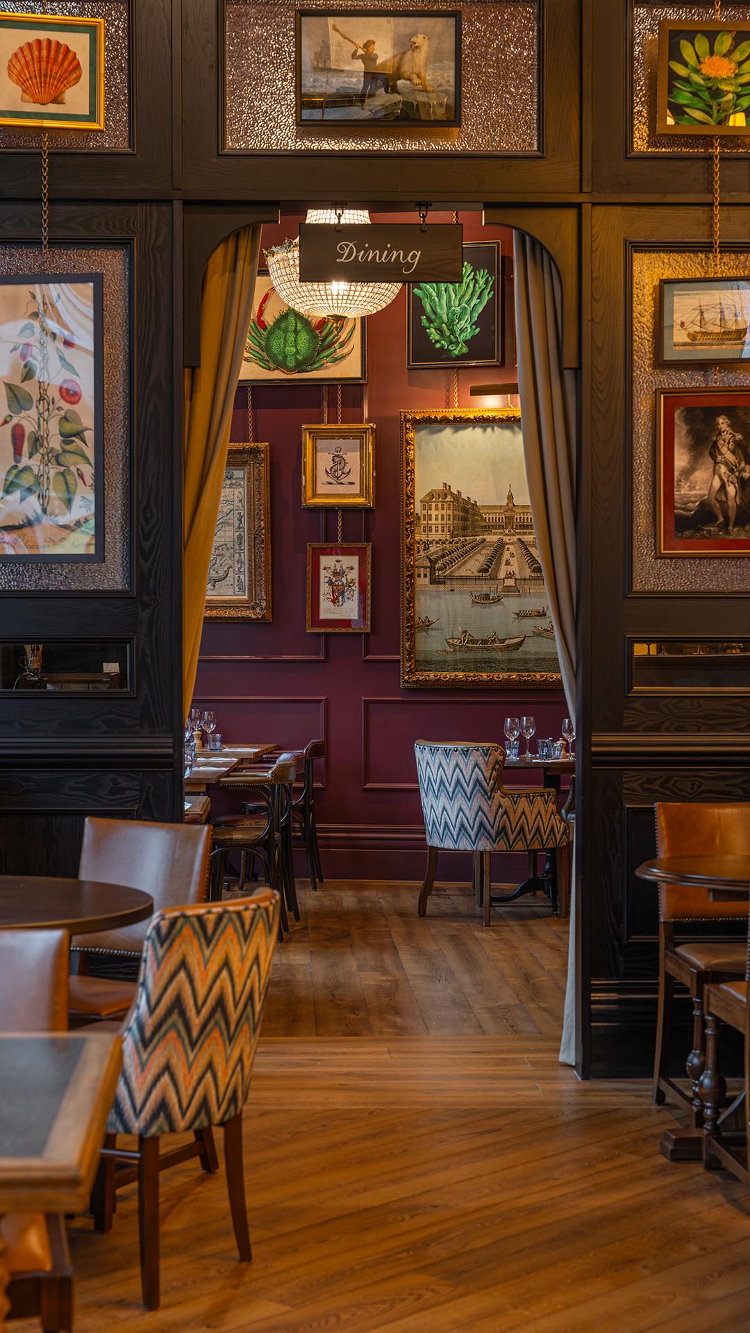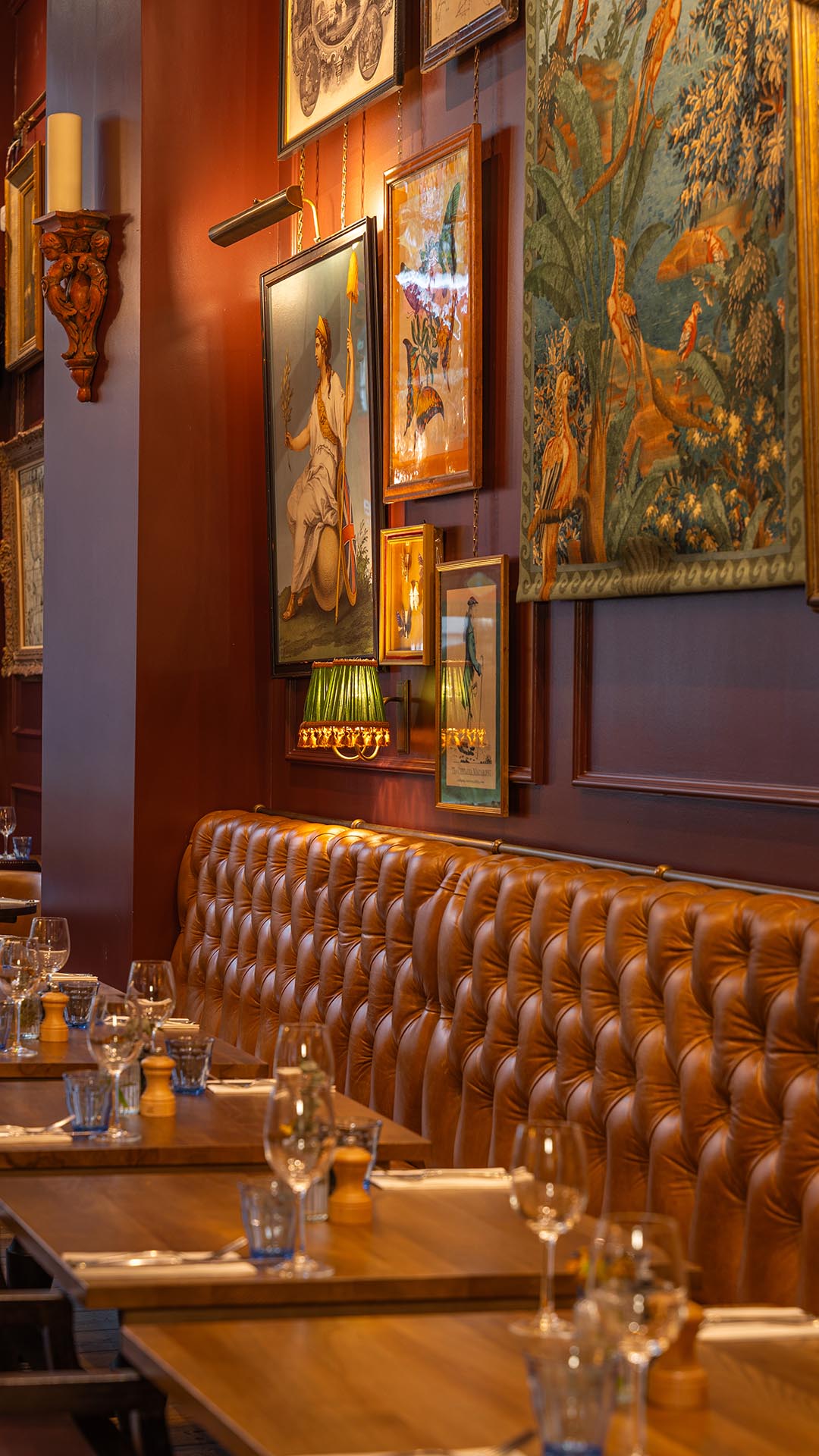 Next to the Old Banking Hall, accessed through two glazed, panelled archways, is the Dining Room, which seats up to 45 guests. Rich burgundy walls and a curated mix of vintage, contemporary and bespoke artwork and tapestries create an intimate feel. Velvet tasselled wall lights, empire chandeliers, dark wooden tables and tan leather banquette seating come together to form a characterful and welcoming space.