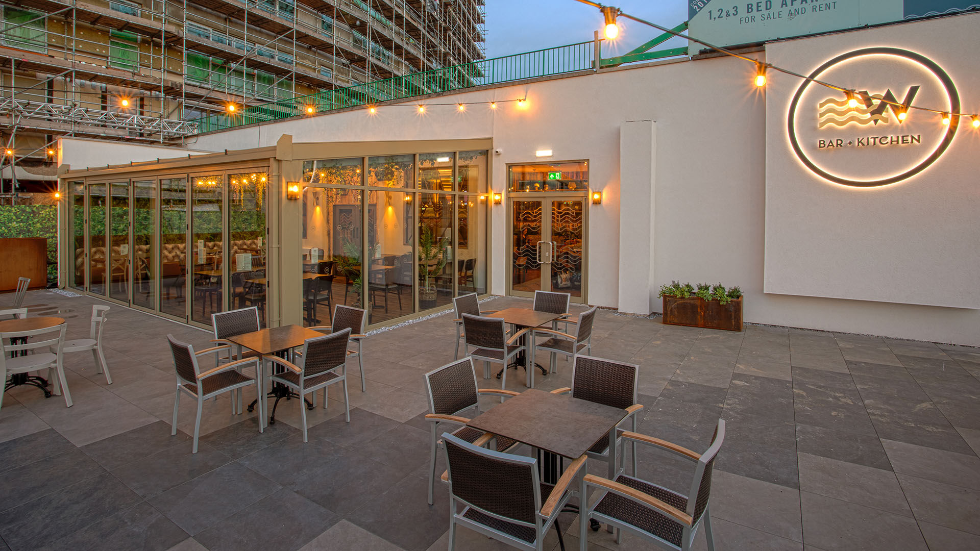 No longer just a sports bar, Waterside is a cool place to hangout where you can grab a bite to eat or a refreshment. Special attention was paid to the bar which now boasts a fully decorative metal back fitting and a reclaimed bar front with LED strip lighting. We also fitted two large fixed seating booths to add extra covers. The garden has been landscaped to perfection, features plenty of new furniture and lighting making it useable year round.