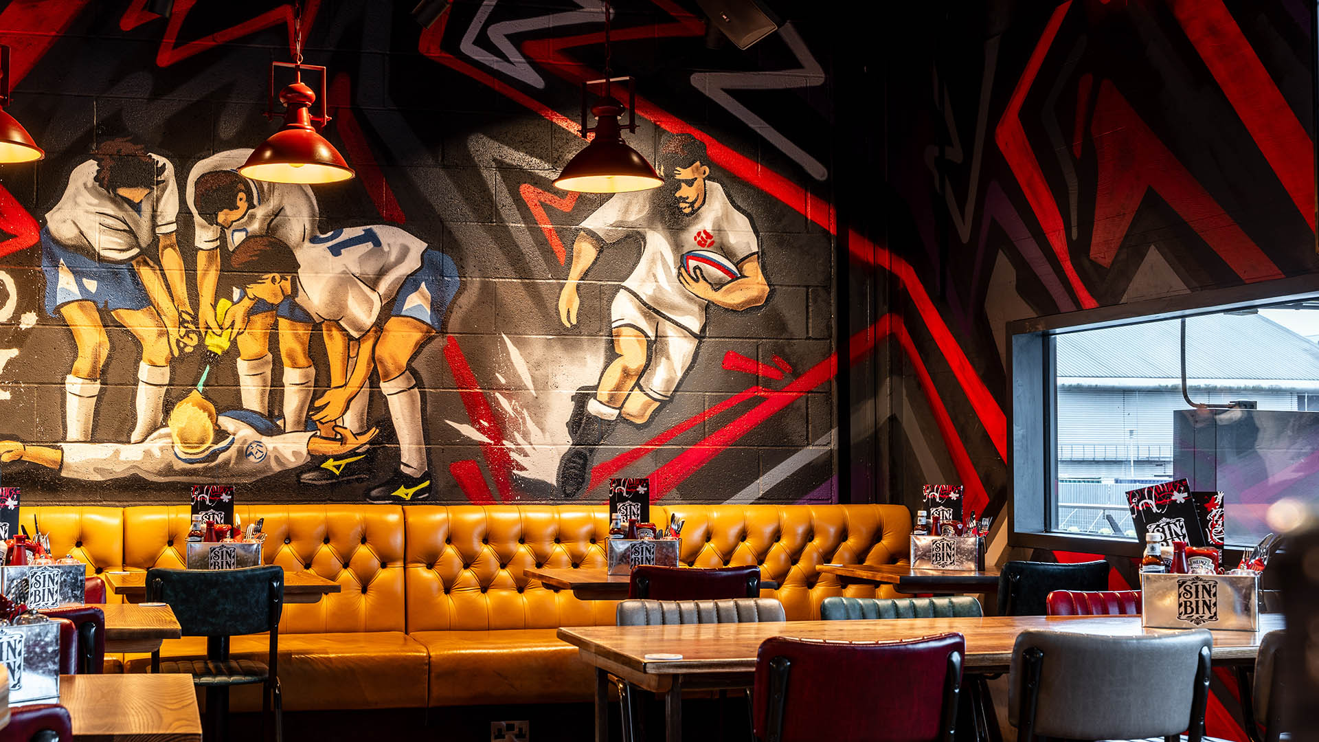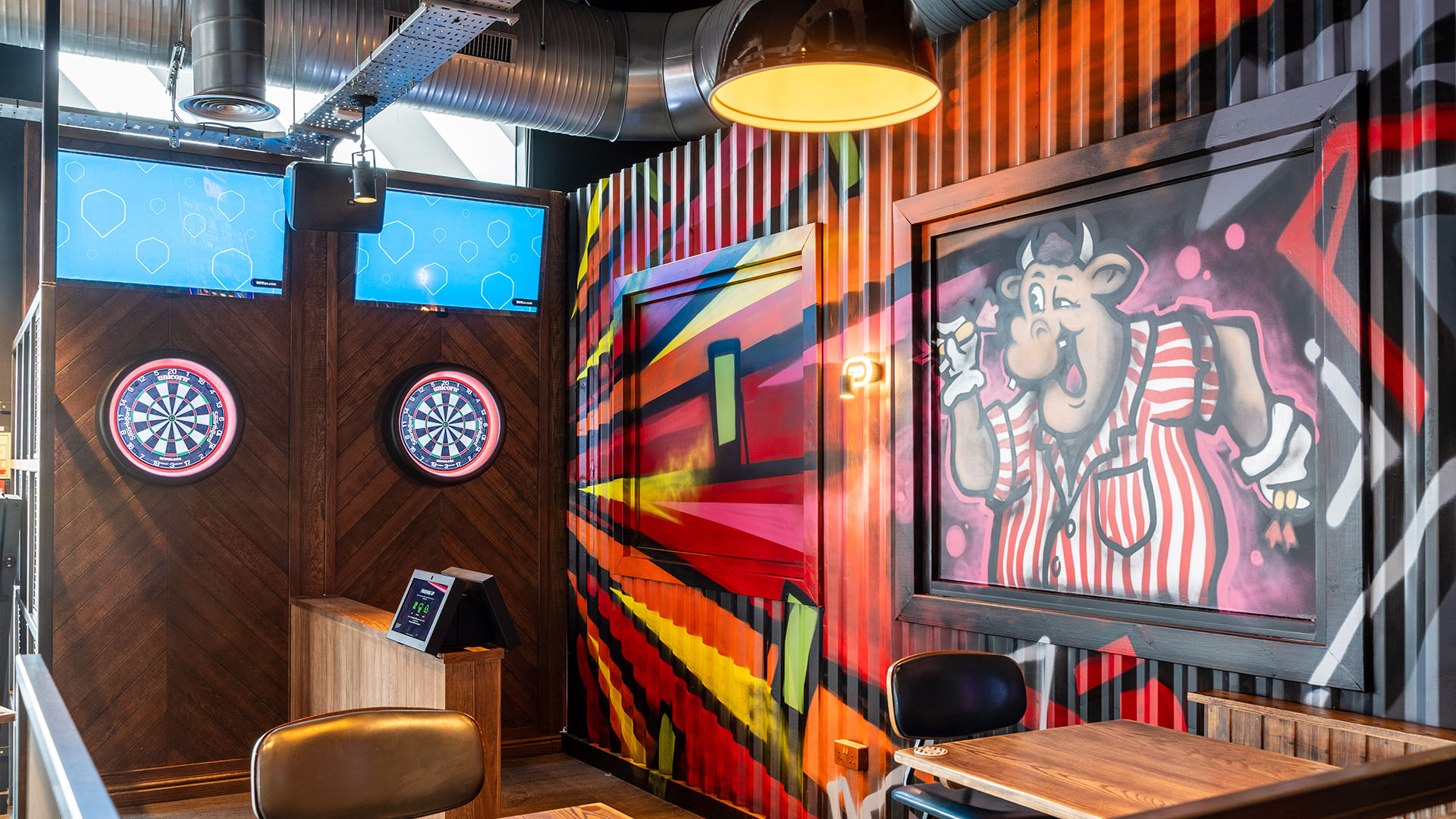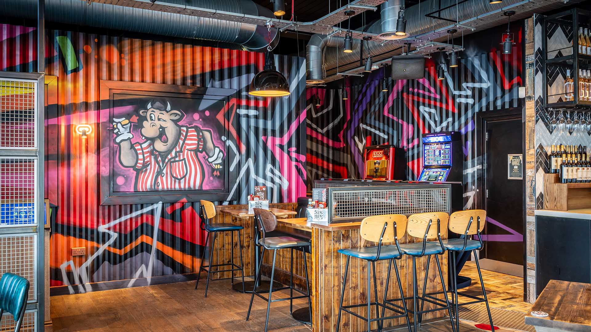 Working with Shepherd Neame, we have created a high-energy and immersive space dedicated to live sport, social gaming, and bold food and drink. Striking tags and murals create a bold and unique backdrop to the venue, complemented by a bespoke resin bar top celebrating iconic sporting moments and memorabilia. Multiple large screens have been incorporated to show live sport throughout, alongside interactive darts and retro gaming consoles built into booth seating.