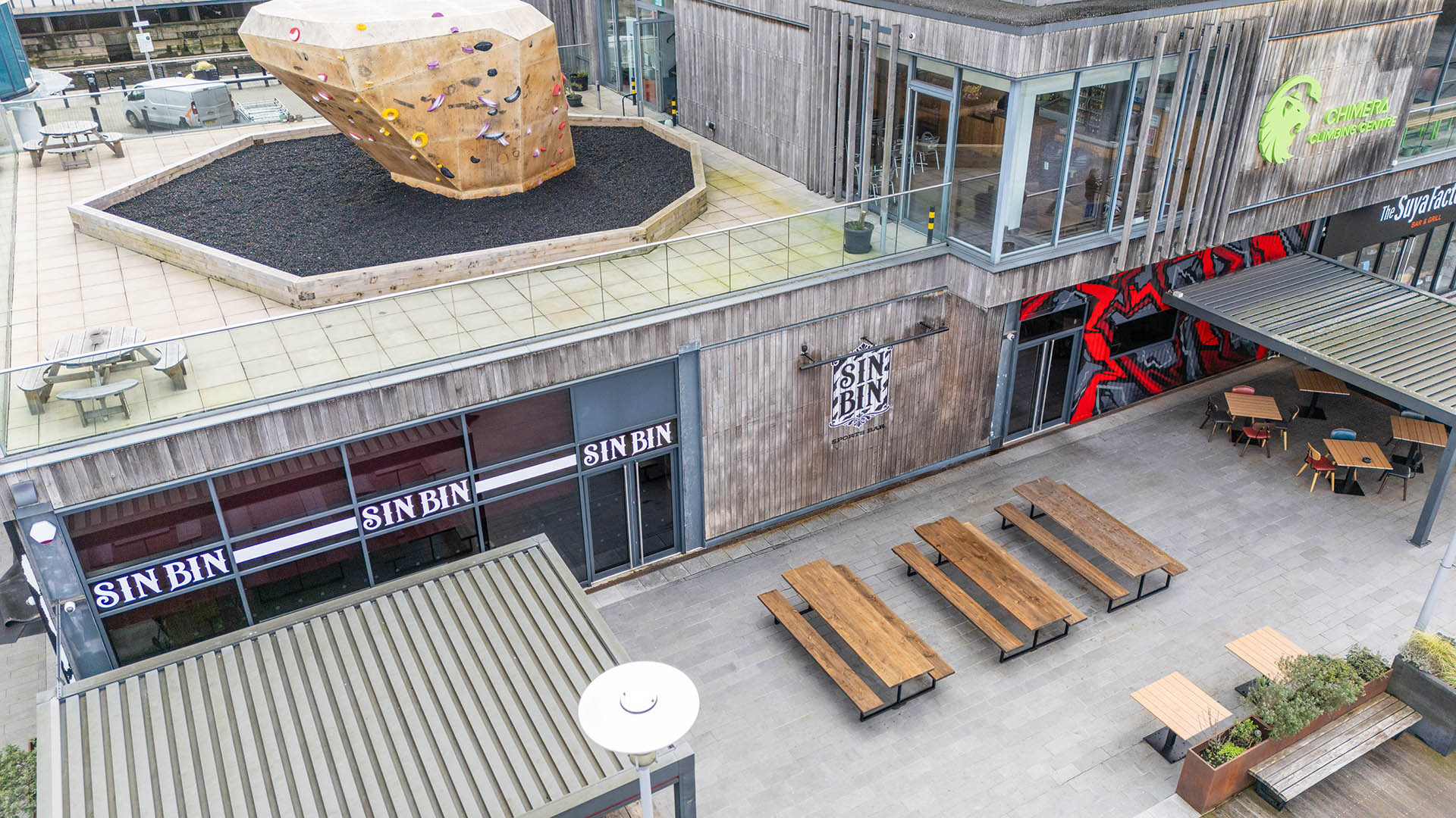 The venue includes an expansive main space with a range of booths, a bookable mezzanine area, and a large outdoor terrace, providing a flexible setting for both everyday use and group bookings.