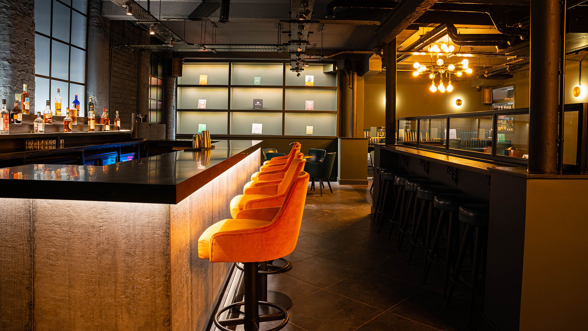 This day-to-night venue sees customers sit at the front of the bar but as the day progresses, a long velvet curtain is drawn back to reveal the full extent of Six Richmond House as a stylish cocktail bar with vintage teal and burnt orange upholstery, marble effect tables - each with an individual lamp - and dimmed lighting for an intimate atmosphere.