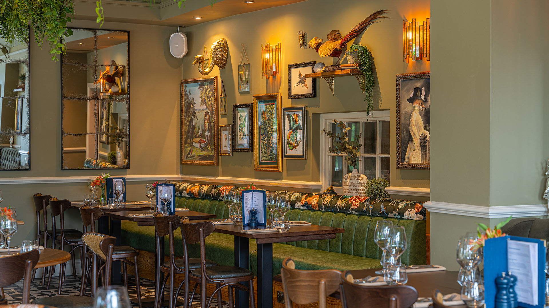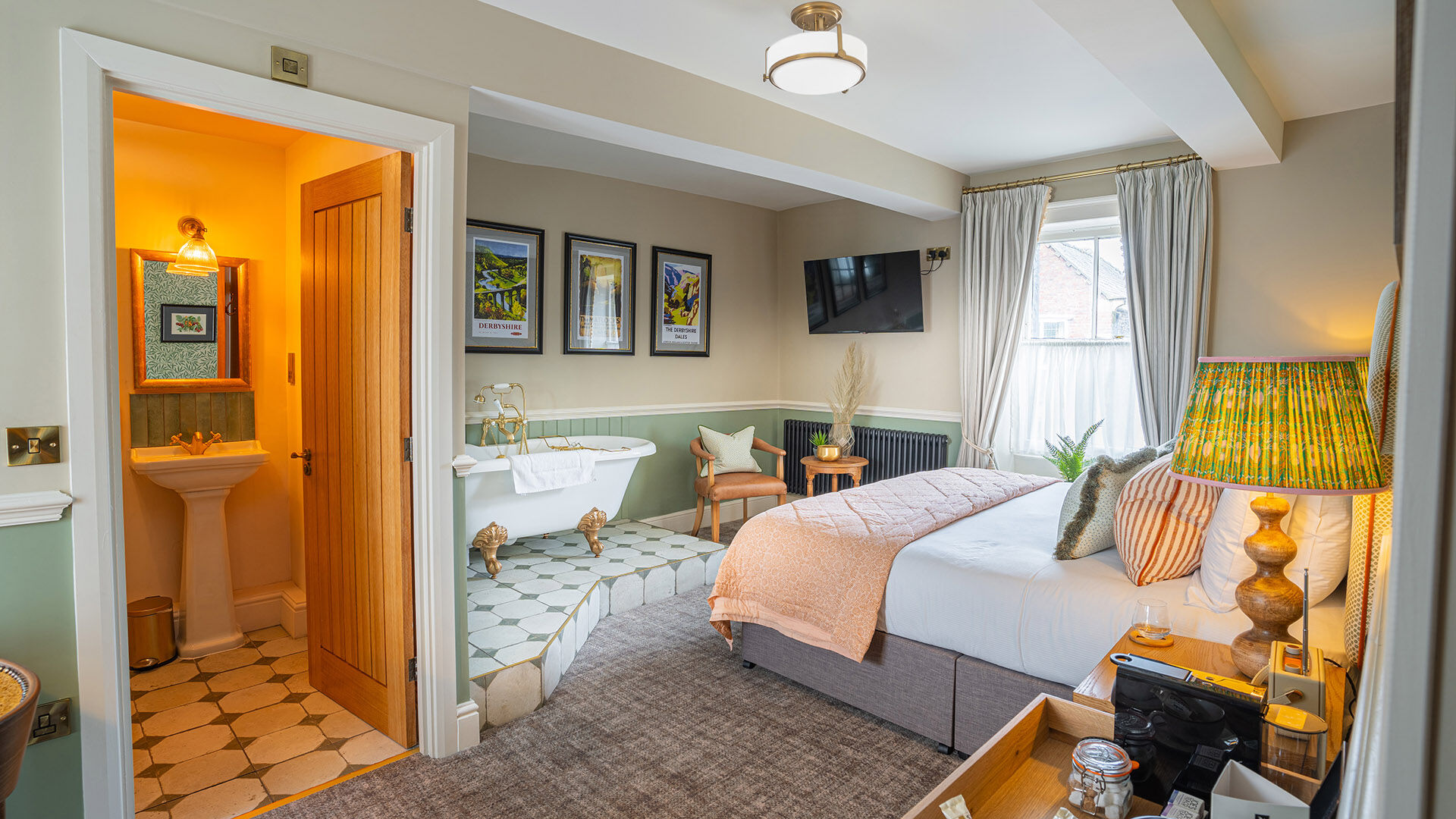The bedrooms provide guests with a relaxing retreat after a day in the Derbyshire dales, with a palette calming greens and pinks, woven through the delicate patterned fabrics and paint colours. Downstairs, IDA have worked their magic to create vibrant bar and dining areas, as well as adding an indoor/outdoor structure with a retractable canopy to create an alfresco dining room leading out into the garden.