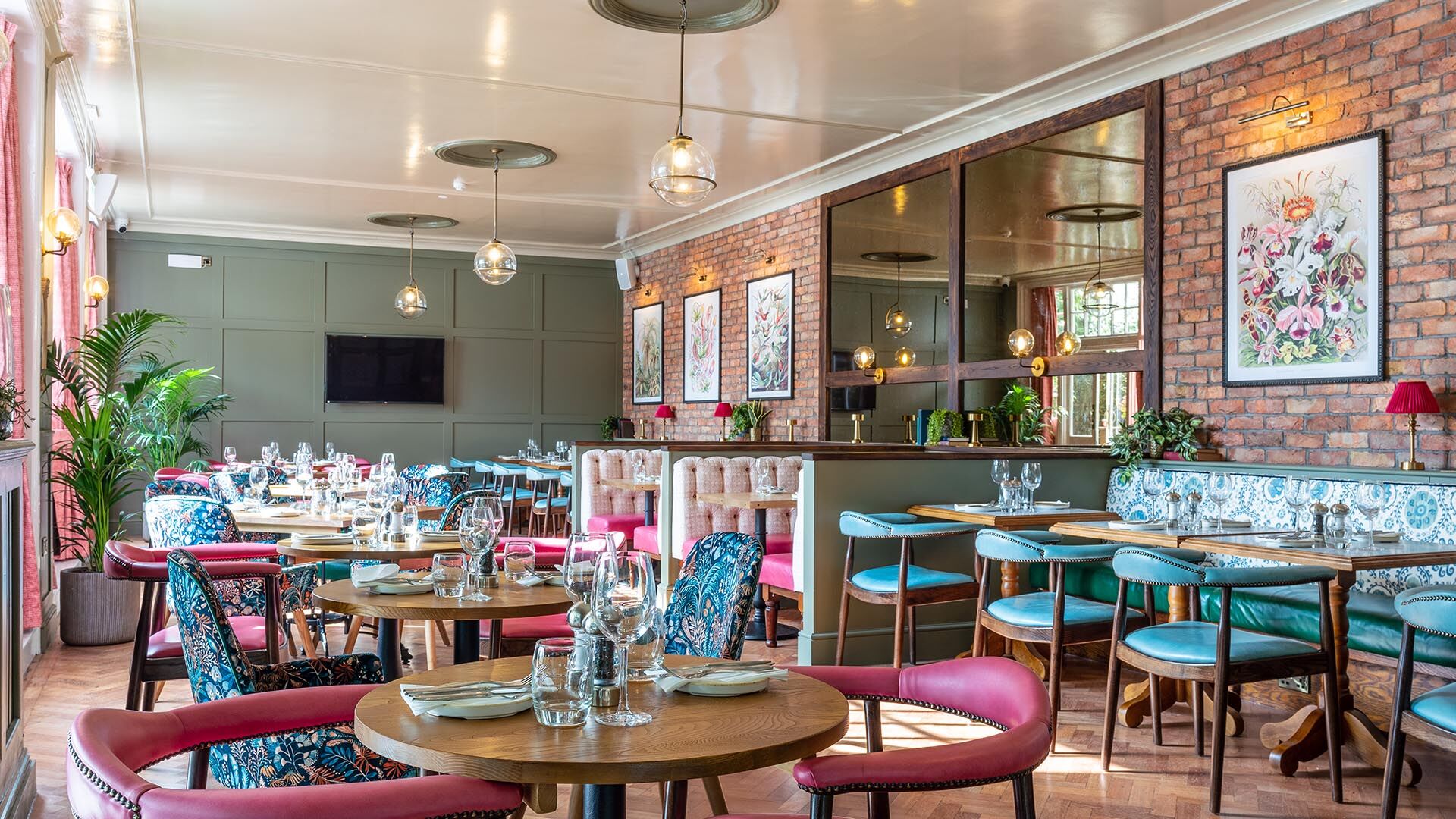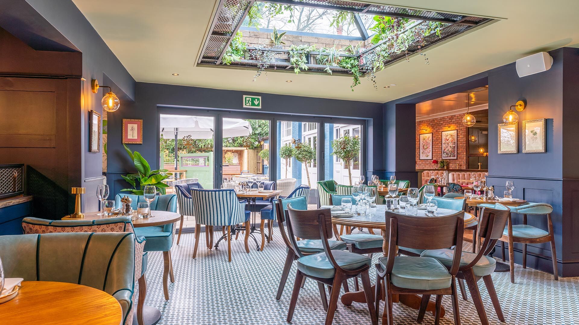 Exposed bricks contrast against feature planting and the brass bar top, alongside the continuation of floral prints. Bookable booths have been added alongside sections of comfortable fixed seating, with a mixture of modern furniture in velvets and leather. Simple globe lighting has been used throughout with an abundance of natural light also spilling in from the existing windows, new patio doors and roof lantern. The new roof lantern is adorned with planting which alludes to an orangery style atmosphere.