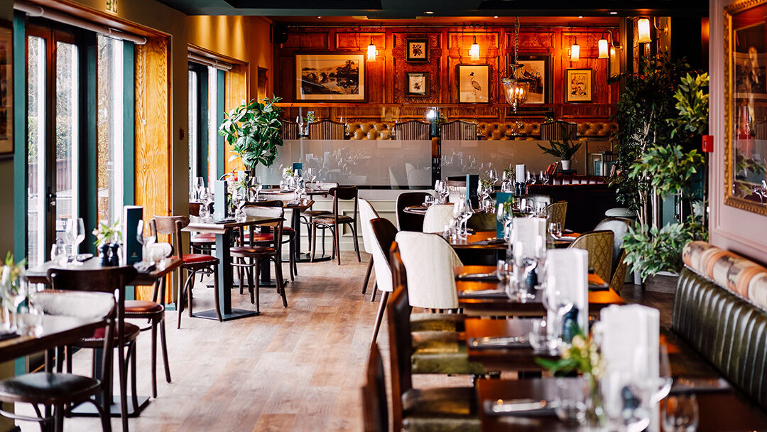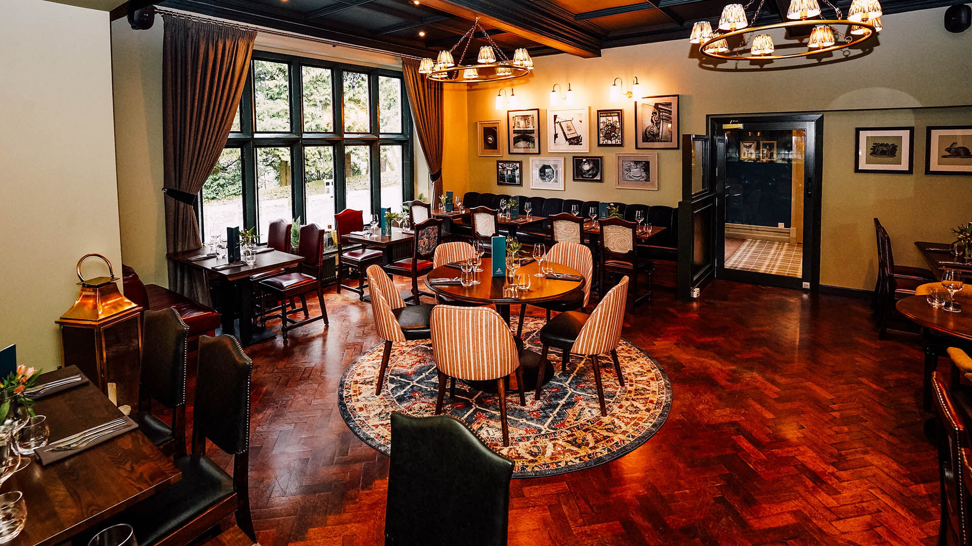 The views from the restaurant over the large garden and rolling hills of the Peak District are breath taking. New timber reveals around the windows is a fresh take on a traditional design feature which has been used to frame the view in a picturesque way.