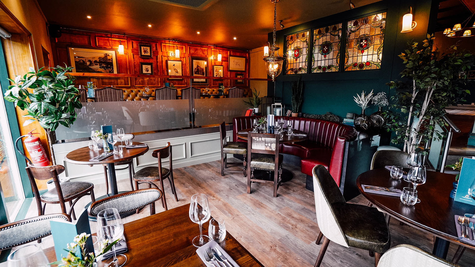 A purpose-built, emerald green partition wall breaks up the dining space, its stunning yet serves a practical, noise reducing purpose. Its frame holds three, one of a kind, stained glass windows believed to date back to the 19th Century. These windows were sourced from an independent supplier in Portsmouth to suit the exact requirements of The Maynard’s style.