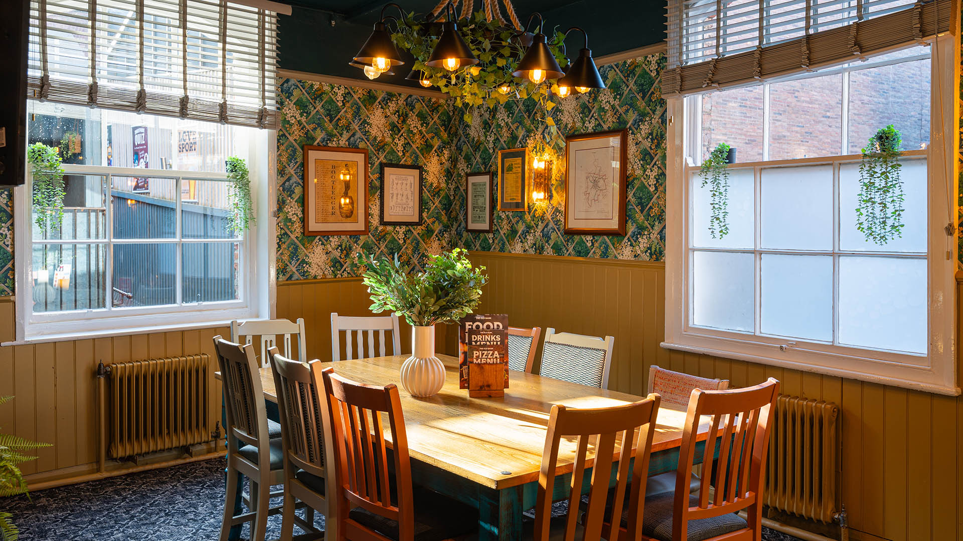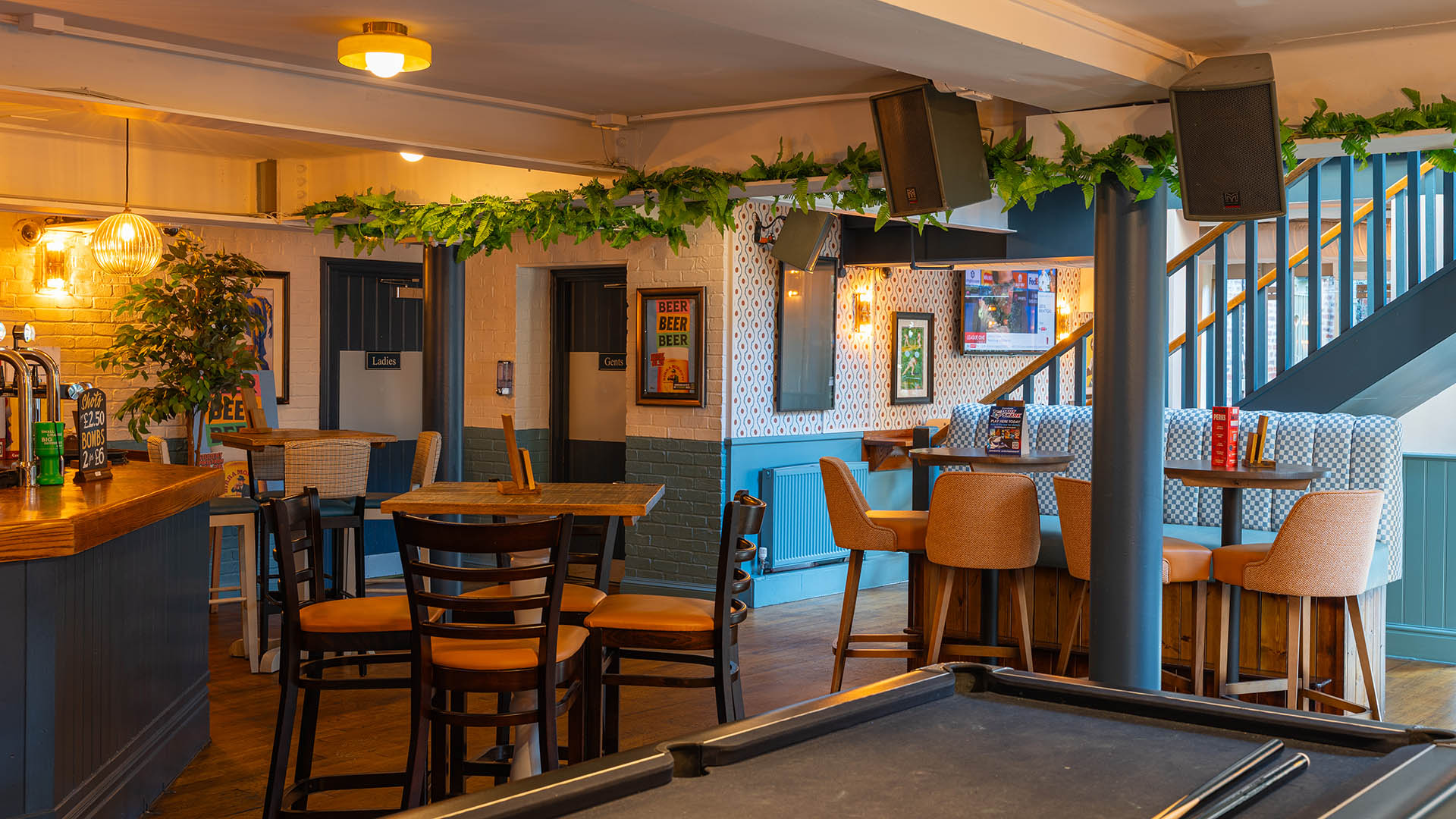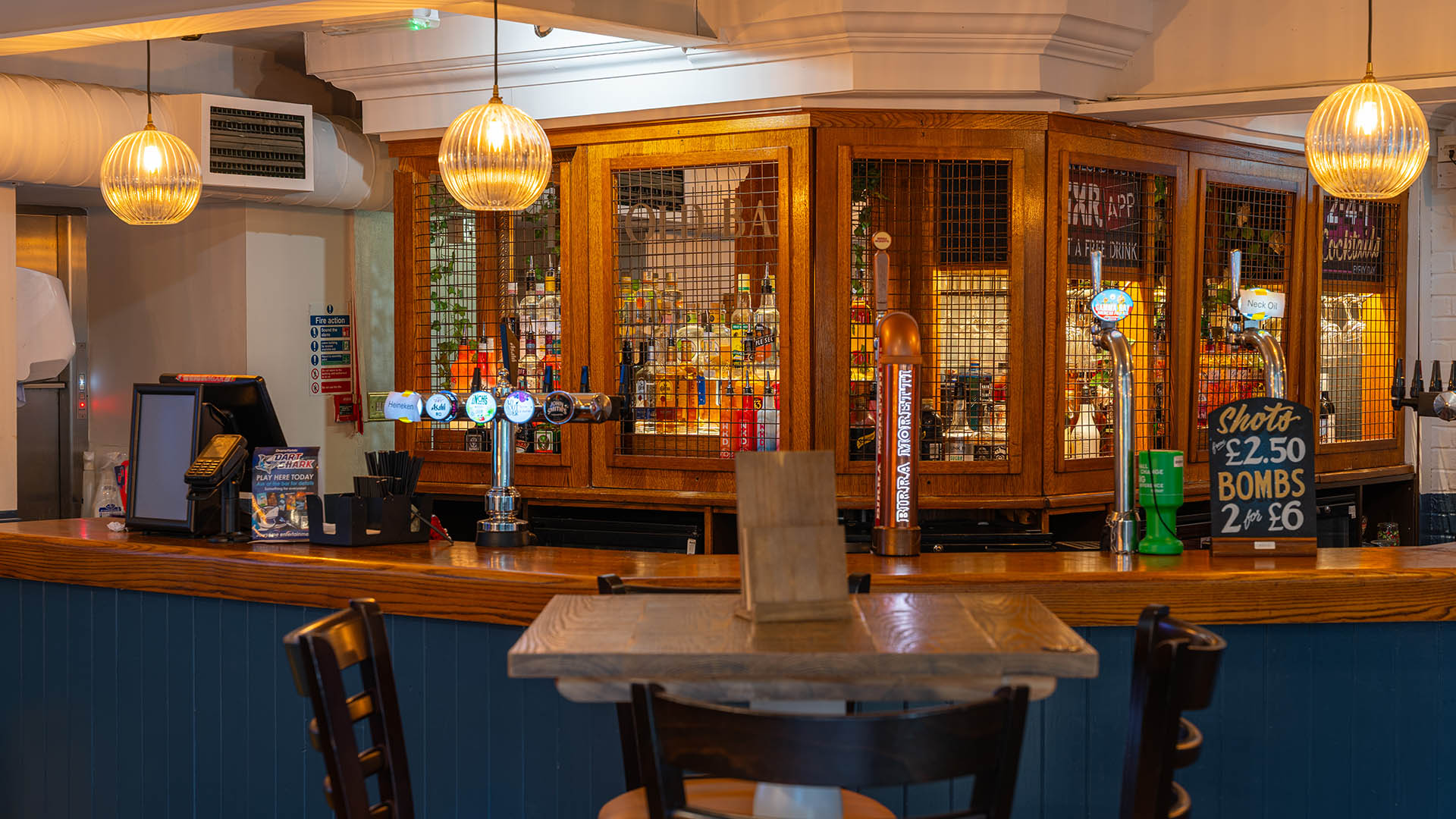 The bar area has been updated with new wallpaper and wall colours to lift the space, along with new fixed seating finished in vibrant patterned fabrics to create a more lively feel. The bar front has been repainted and new pendant lighting has been installed to bring warmth to the space and enhance the overall atmosphere.