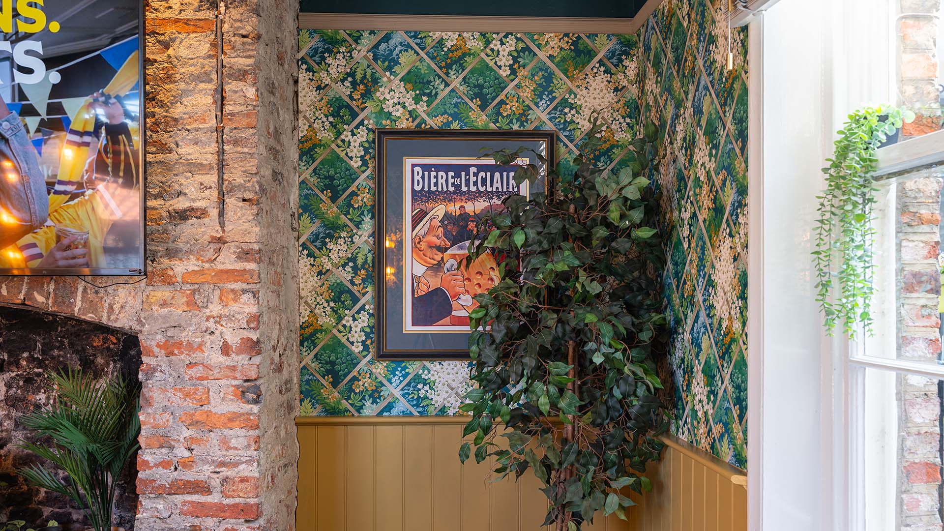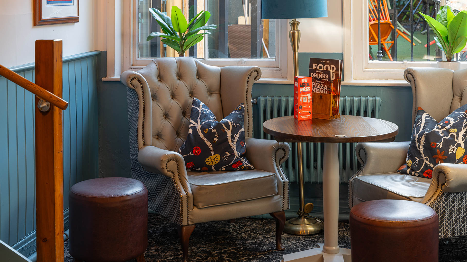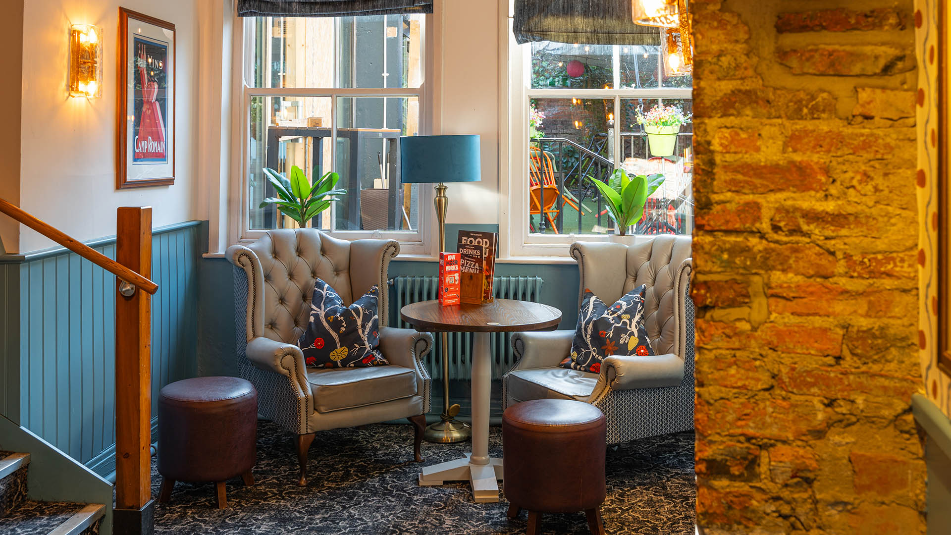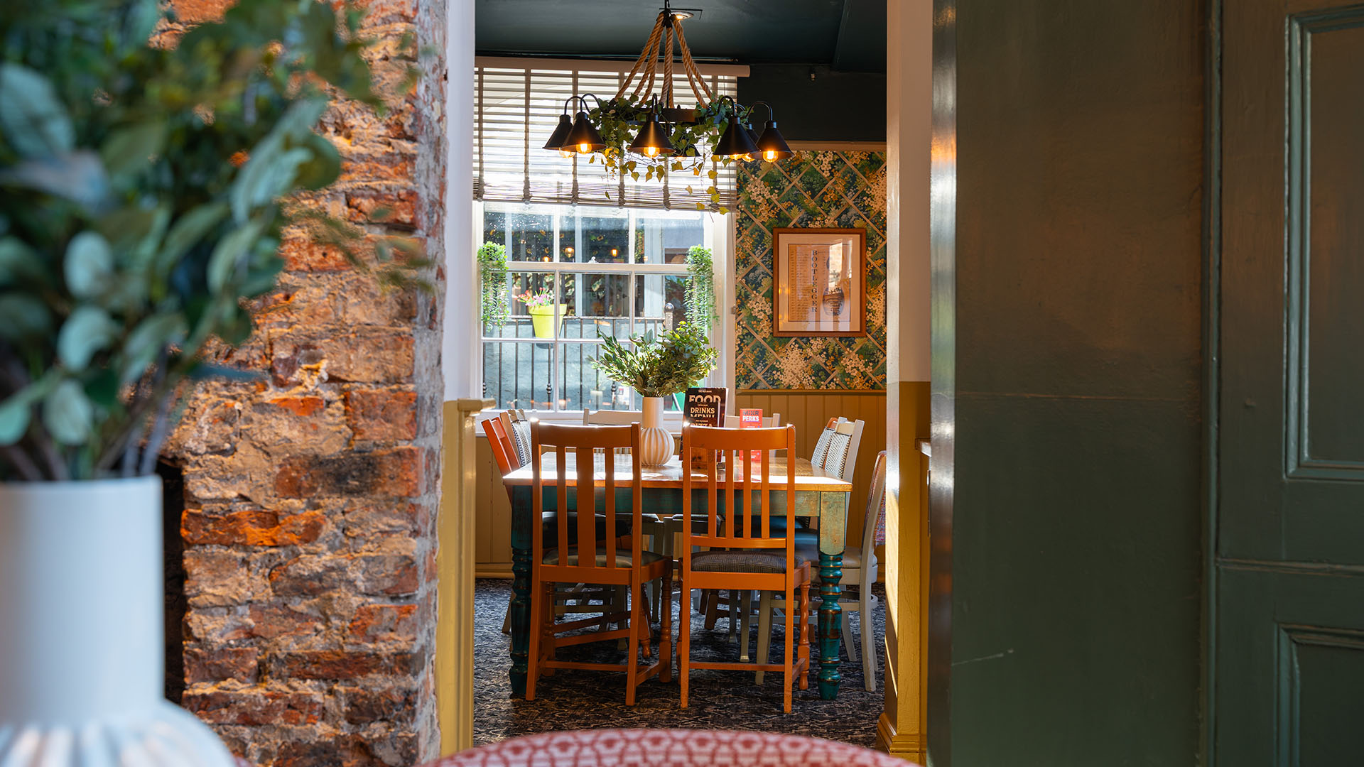 The bar area has been updated with new wallpaper and wall colours to lift the space, along with new fixed seating finished in vibrant patterned fabrics to create a more lively feel. The bar front has been repainted and new pendant lighting has been installed to bring warmth to the space and enhance the overall atmosphere.