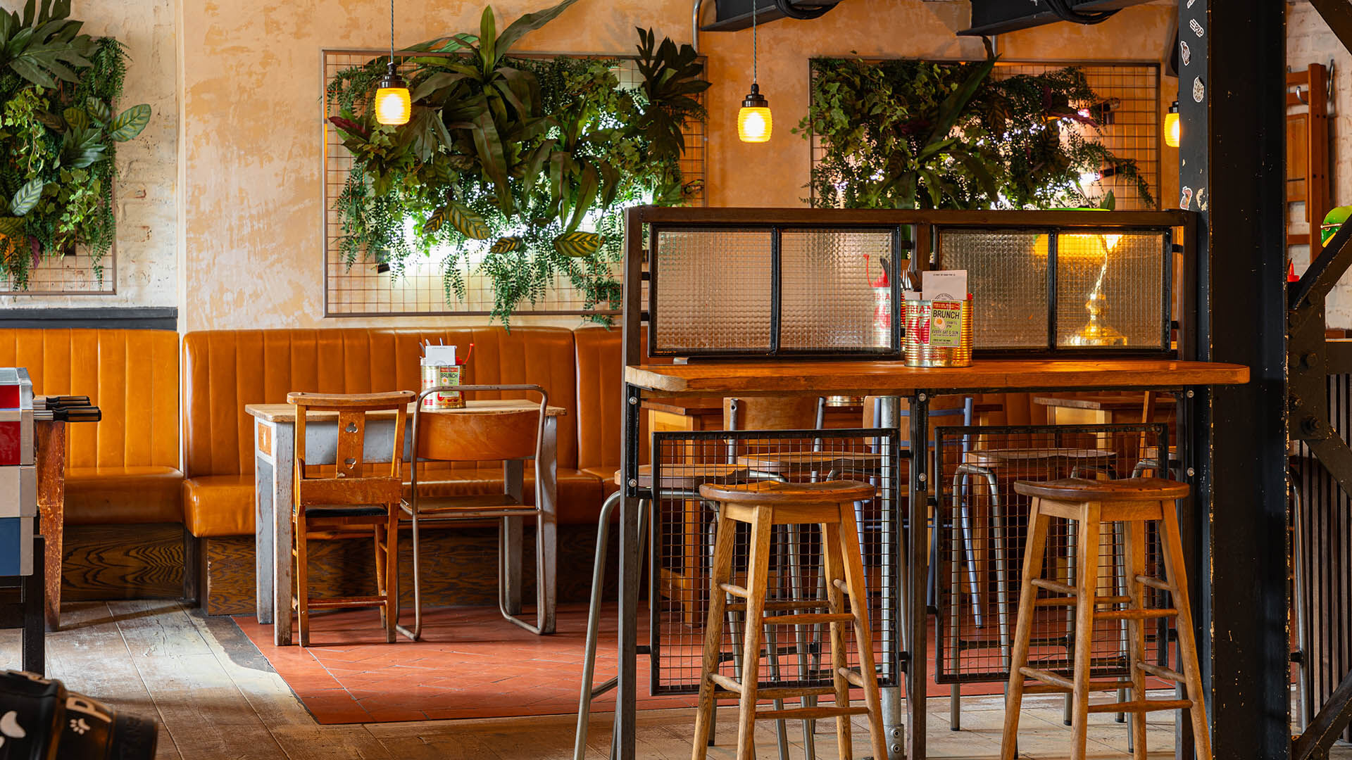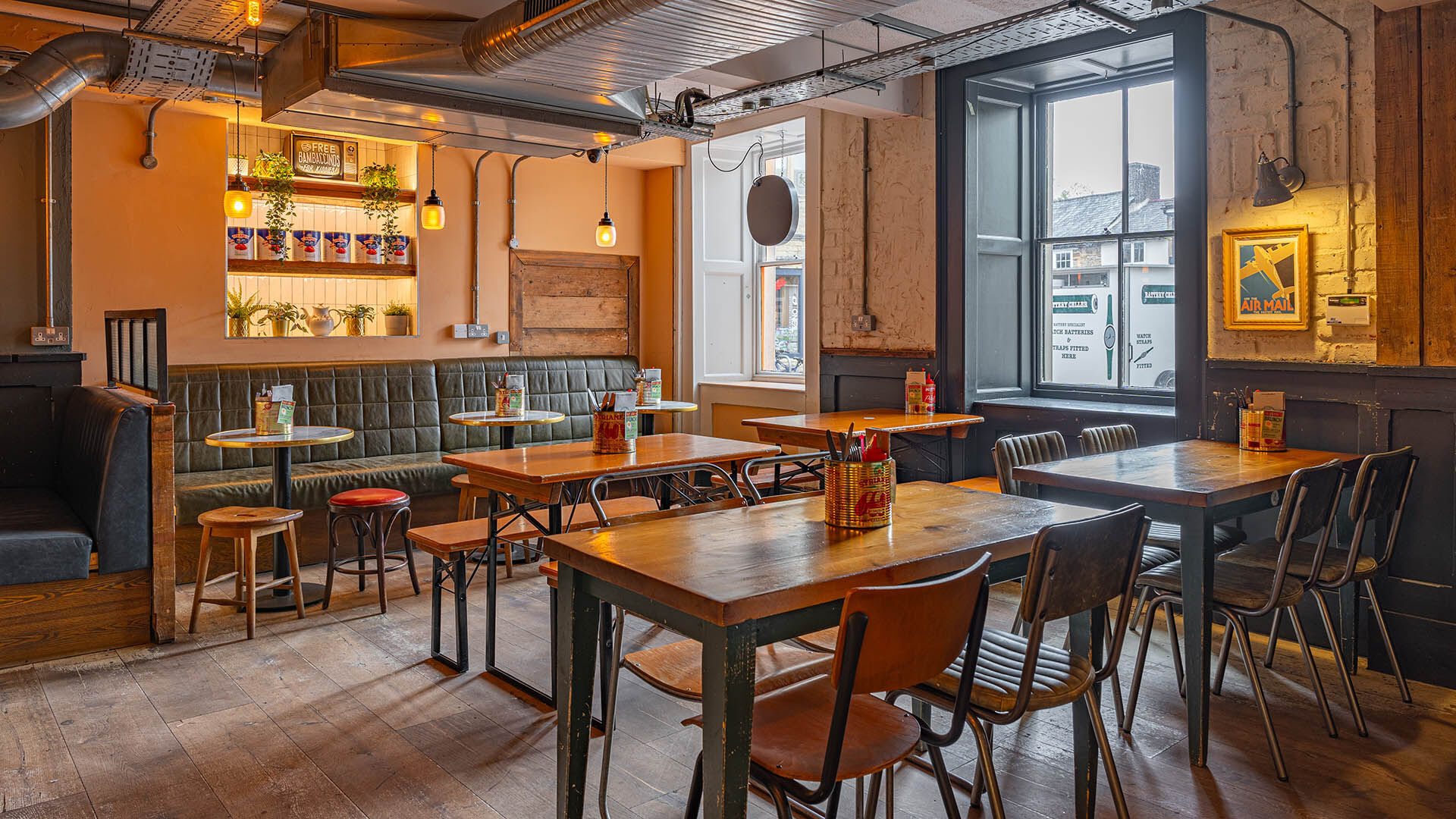This previous Post Office has been transformed into a new high street public house and co-working space in the Oxfordshire town of Witney. Although this site has the usual nods to the Dodo style, with colour blocking, reclaimed furniture, iconic artwork and distressed painted finishes, it also has elements of retro glamour with moulded opal pendants and a new illuminated glass tile bar servery. The back bar features antique brass contrasted against traditional crackle tiles, with pigeonhole shelving to give a nod to the former use of the building.