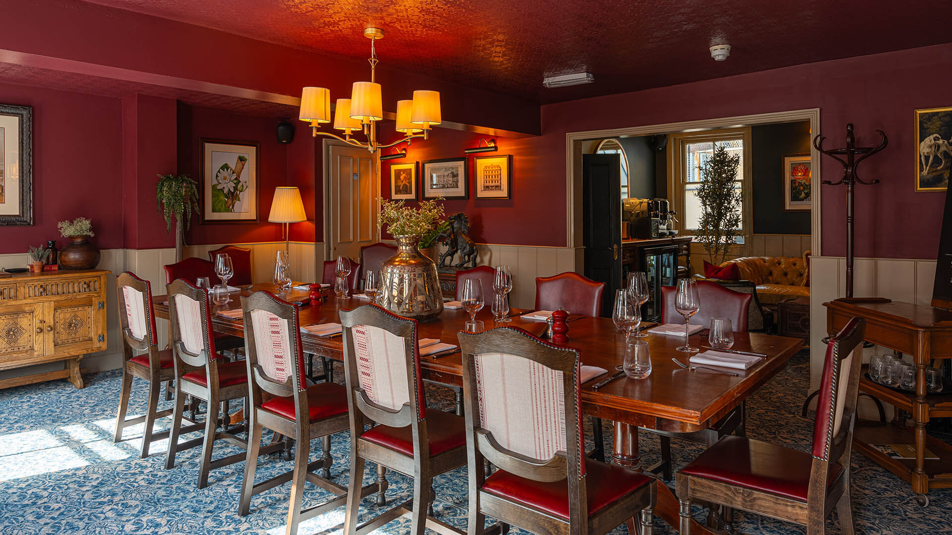 The decor features warm natural hues, complemented by jewel-coloured upholstery in rich blues, teal, and rusty red, creating a warm and inviting atmosphere. The ground floor has a traditional pub atmosphere, where guests can enjoy their drinks at the bar or at a table. The middle floor is great for relaxing with friends, family, or colleagues, with comfortable armchair seating creating a convivial dining room feel. The top floor is dedicated to private dining and events, suitable for intimate dinner celebrations, office gatherings, and family reunions. Each floor offers a different ambience, making it a venue for every occasion.