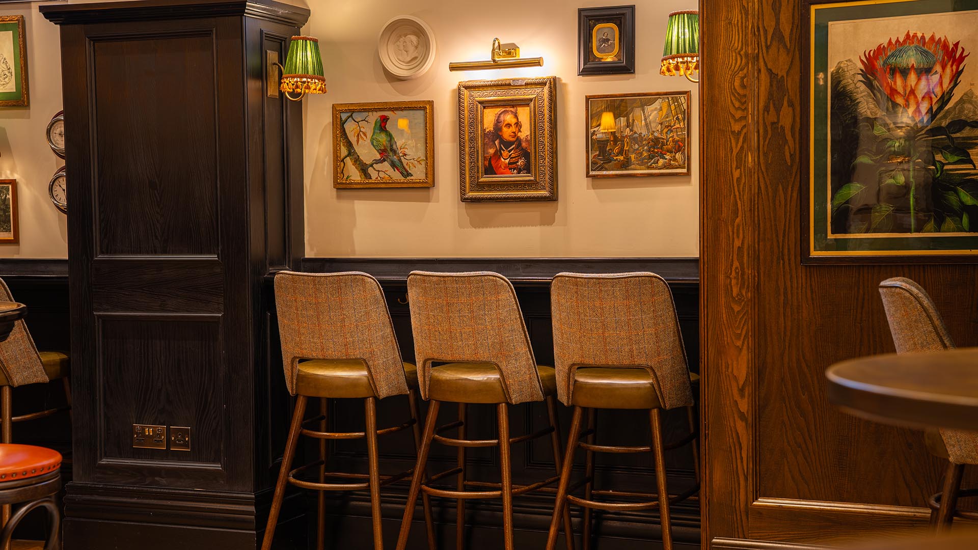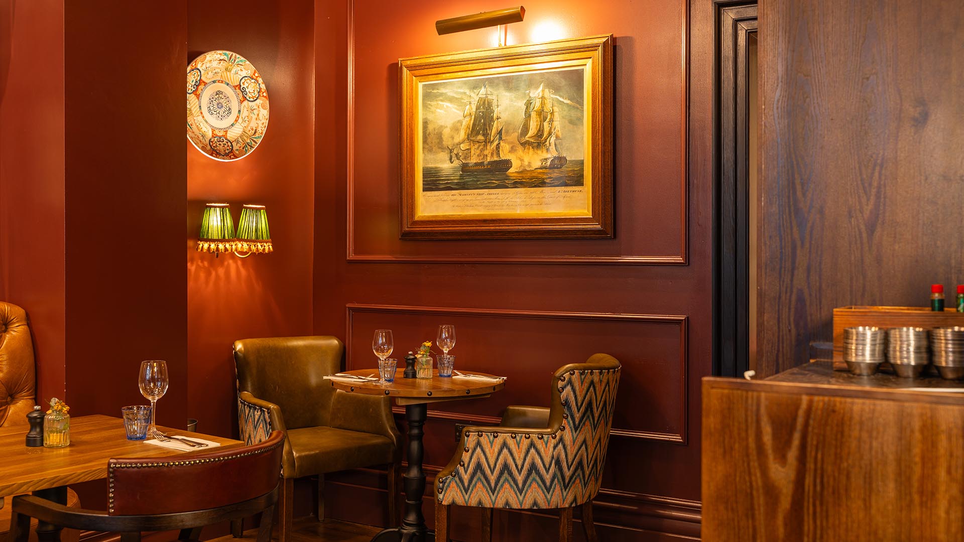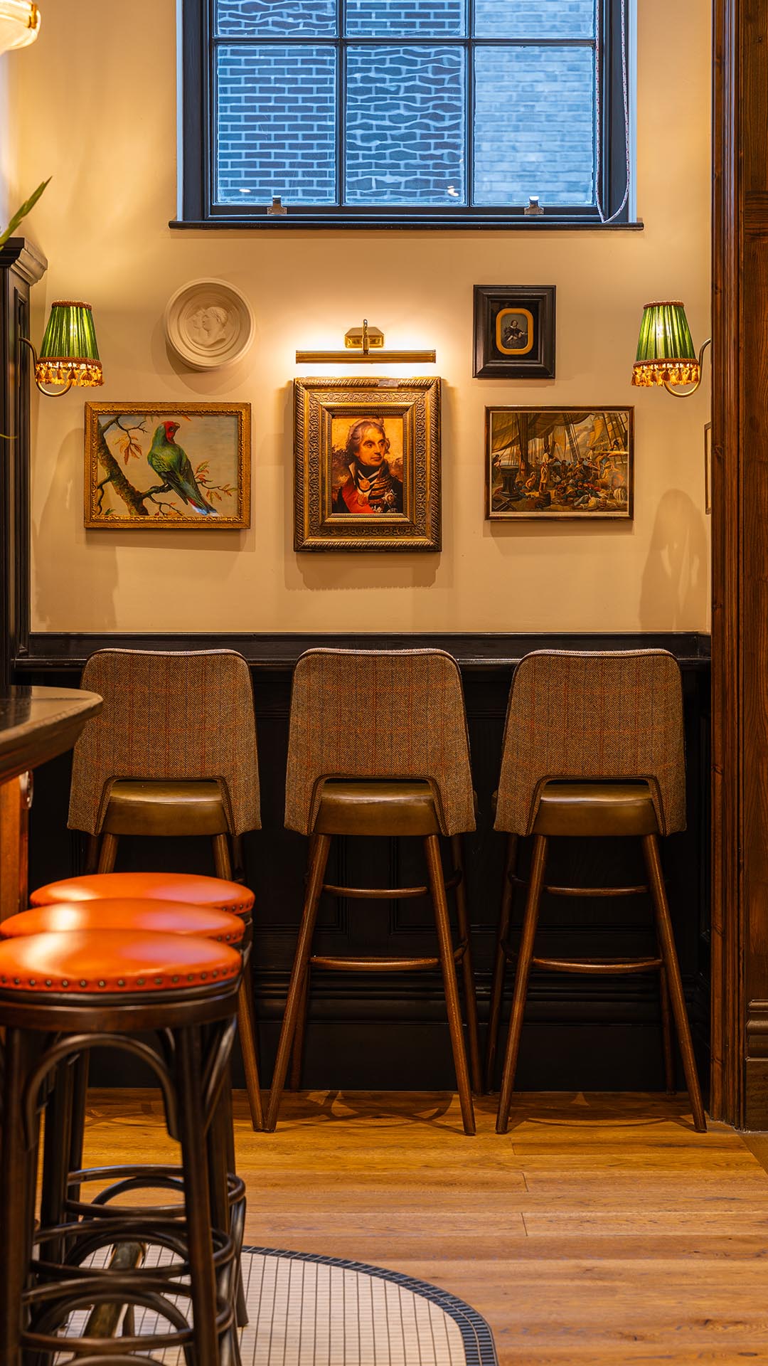 Named after one of Britain’s most decisive victories, The Trafalgar spans two floors. Guests enter through the lobby into the Old Banking Hall, where five-metre-high aged bronze ceilings, four chandeliers and bespoke wallpaper framed by original festoon plasterwork set the tone. Vintage art, original paperwork and oversized lamps create an elegant and timeless atmosphere, while restored Georgian windows and ornate plasterwork blend seamlessly with a warm new interior featuring an impressive bar, intimate booths, leather dining chairs and statement chandeliers.