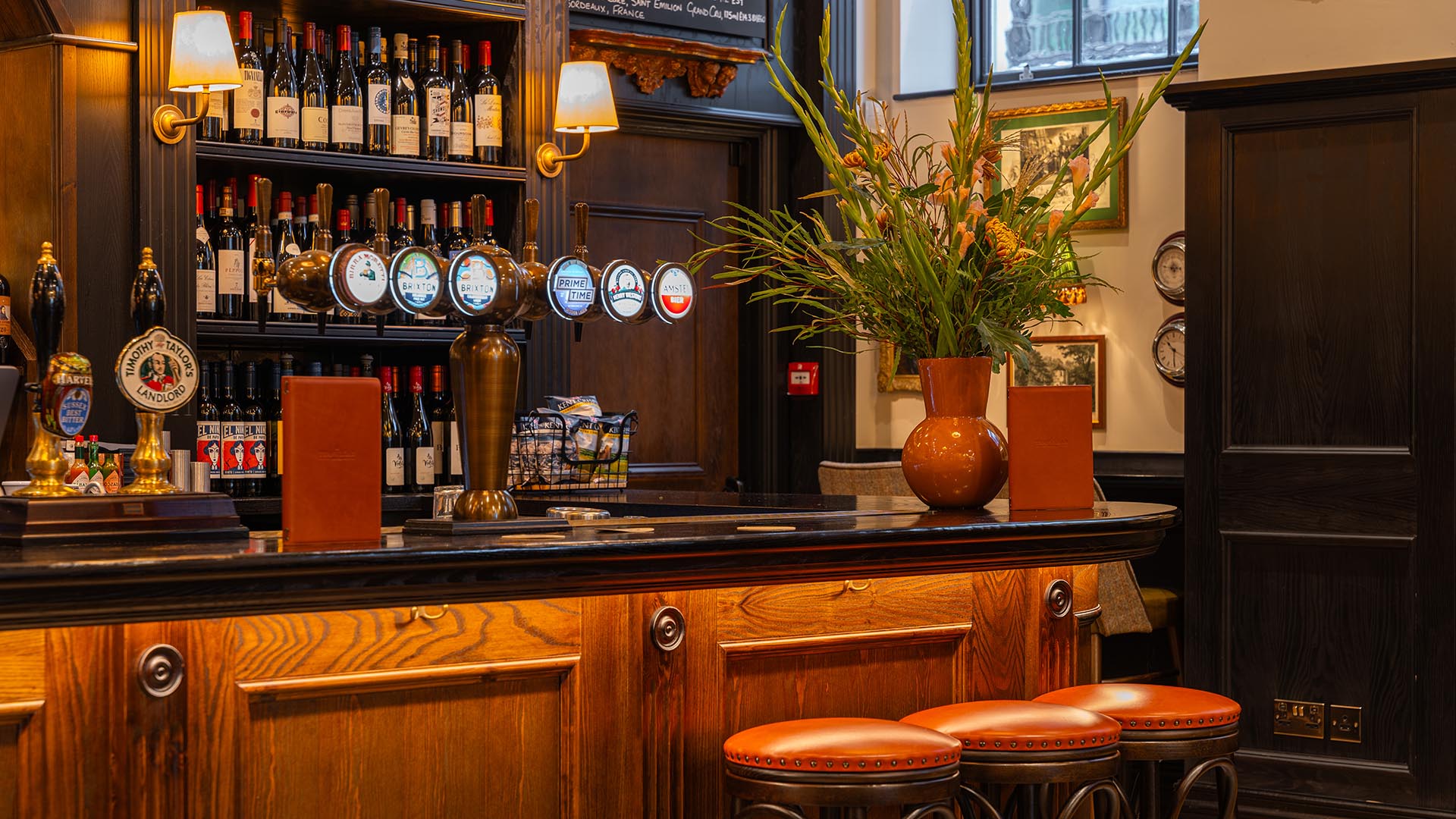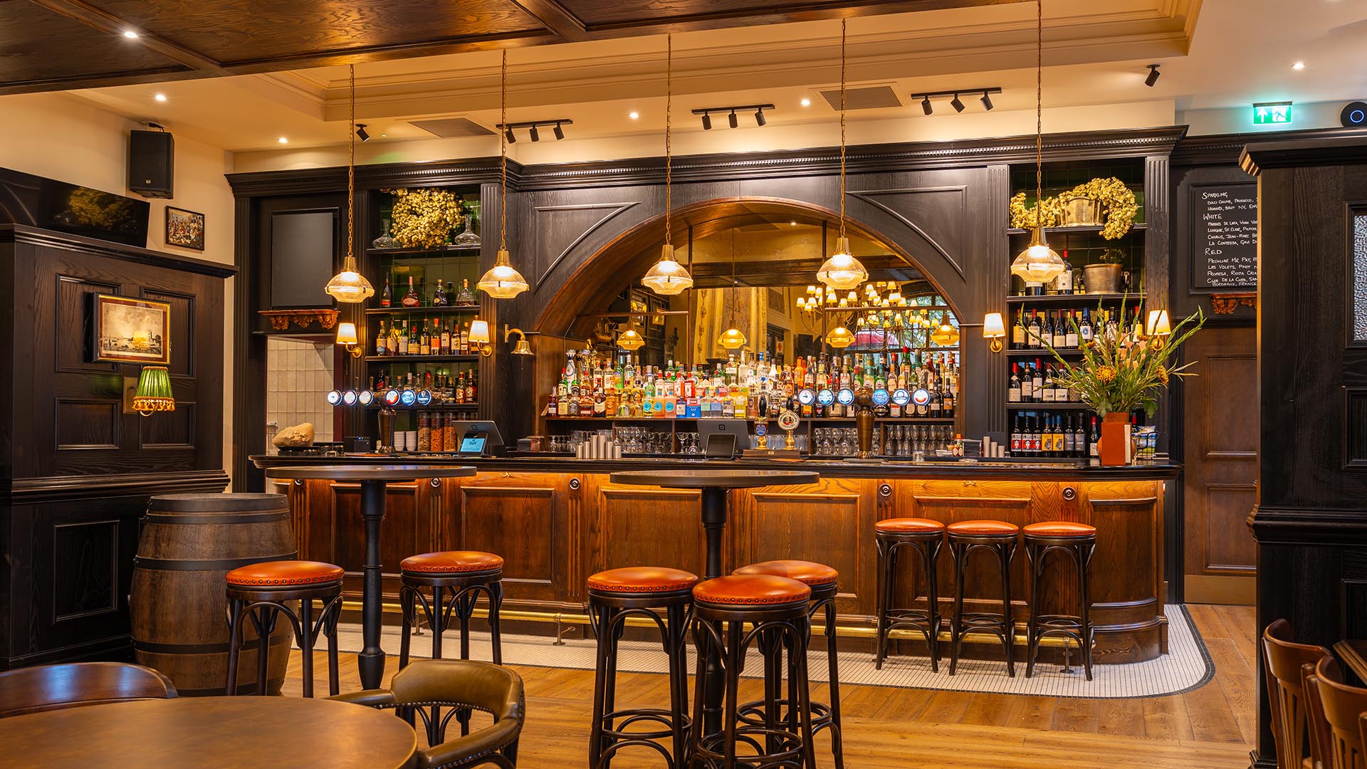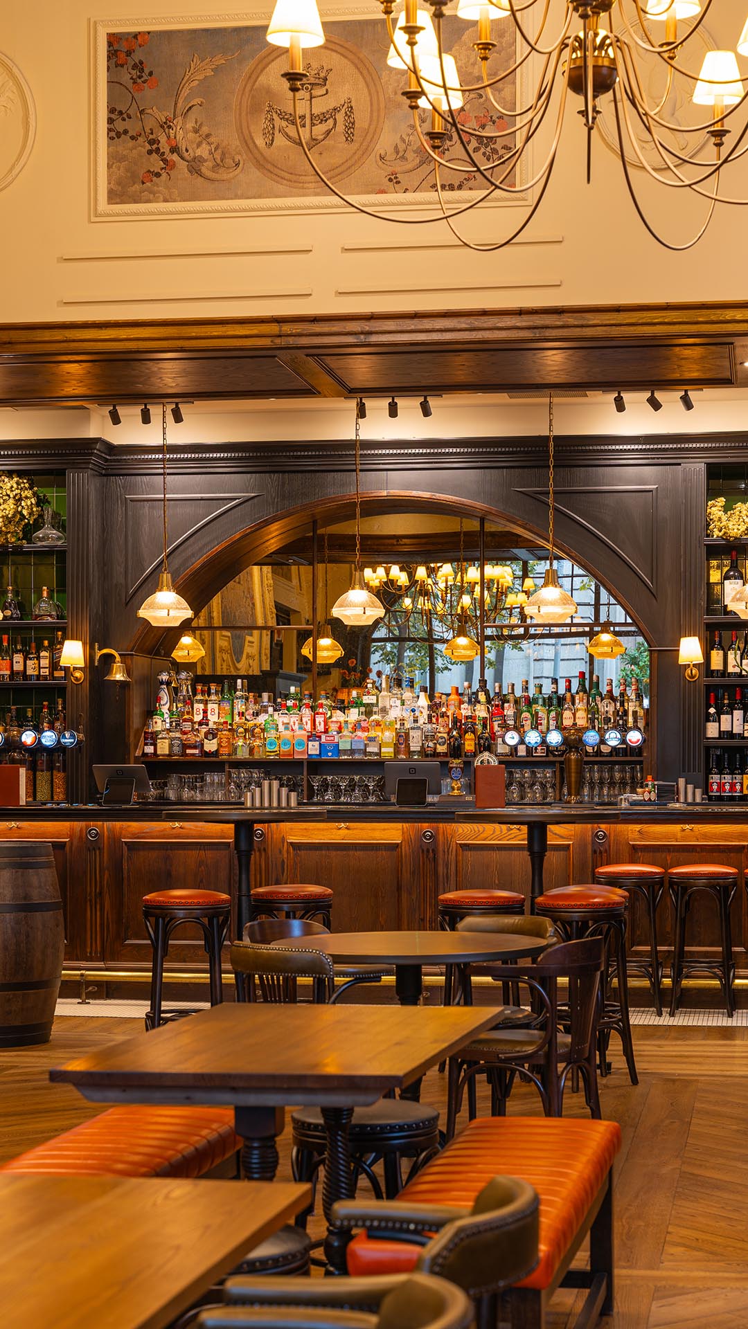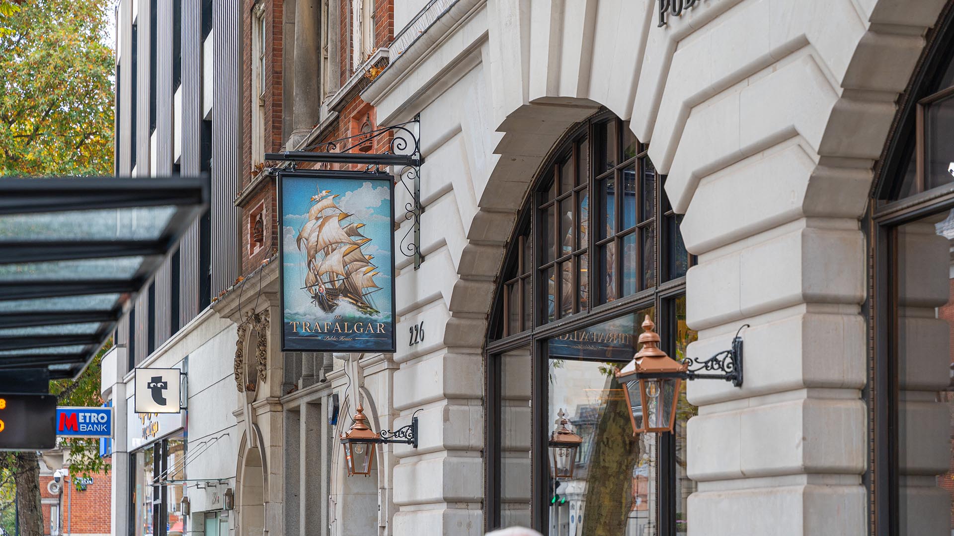 Named after one of Britain’s most decisive victories, The Trafalgar spans two floors. Guests enter through the lobby into the Old Banking Hall, where five-metre-high aged bronze ceilings, four chandeliers and bespoke wallpaper framed by original festoon plasterwork set the tone. Vintage art, original paperwork and oversized lamps create an elegant and timeless atmosphere, while restored Georgian windows and ornate plasterwork blend seamlessly with a warm new interior featuring an impressive bar, intimate booths, leather dining chairs and statement chandeliers.