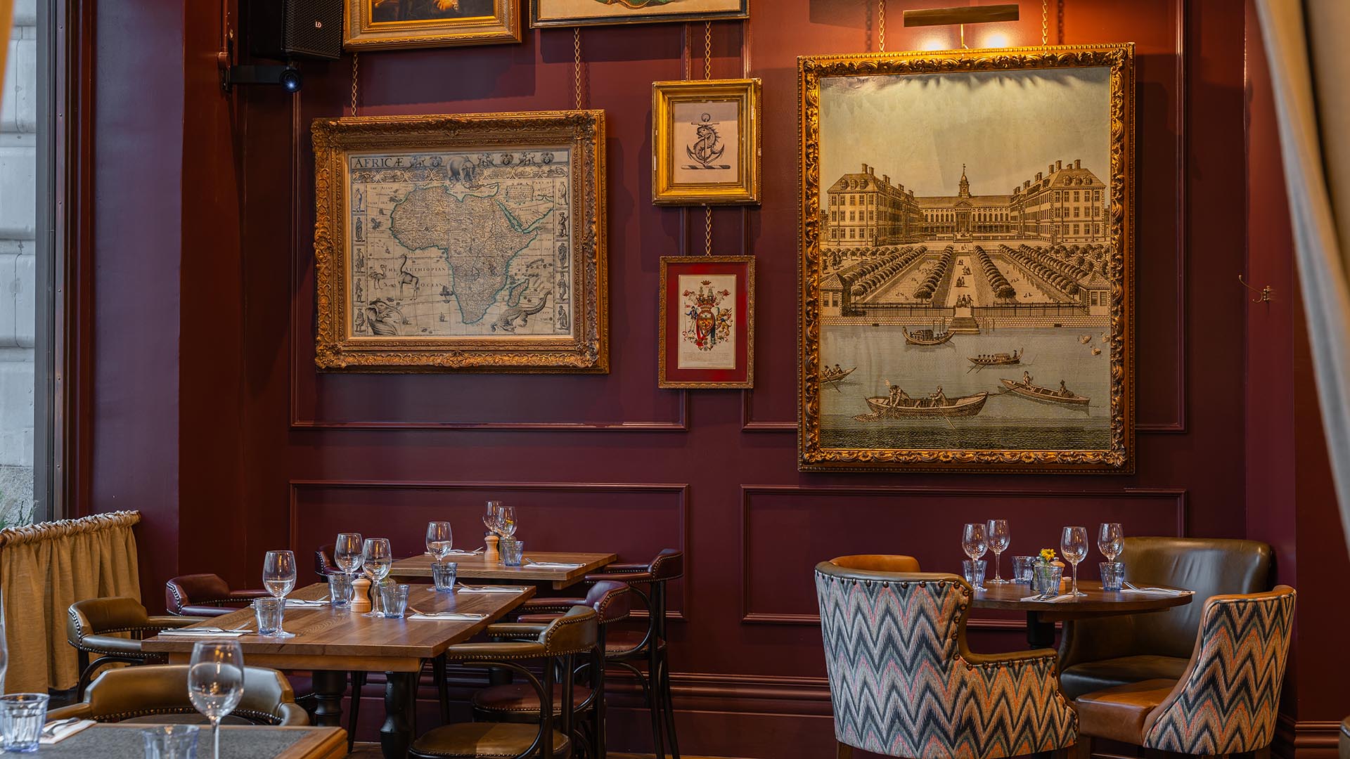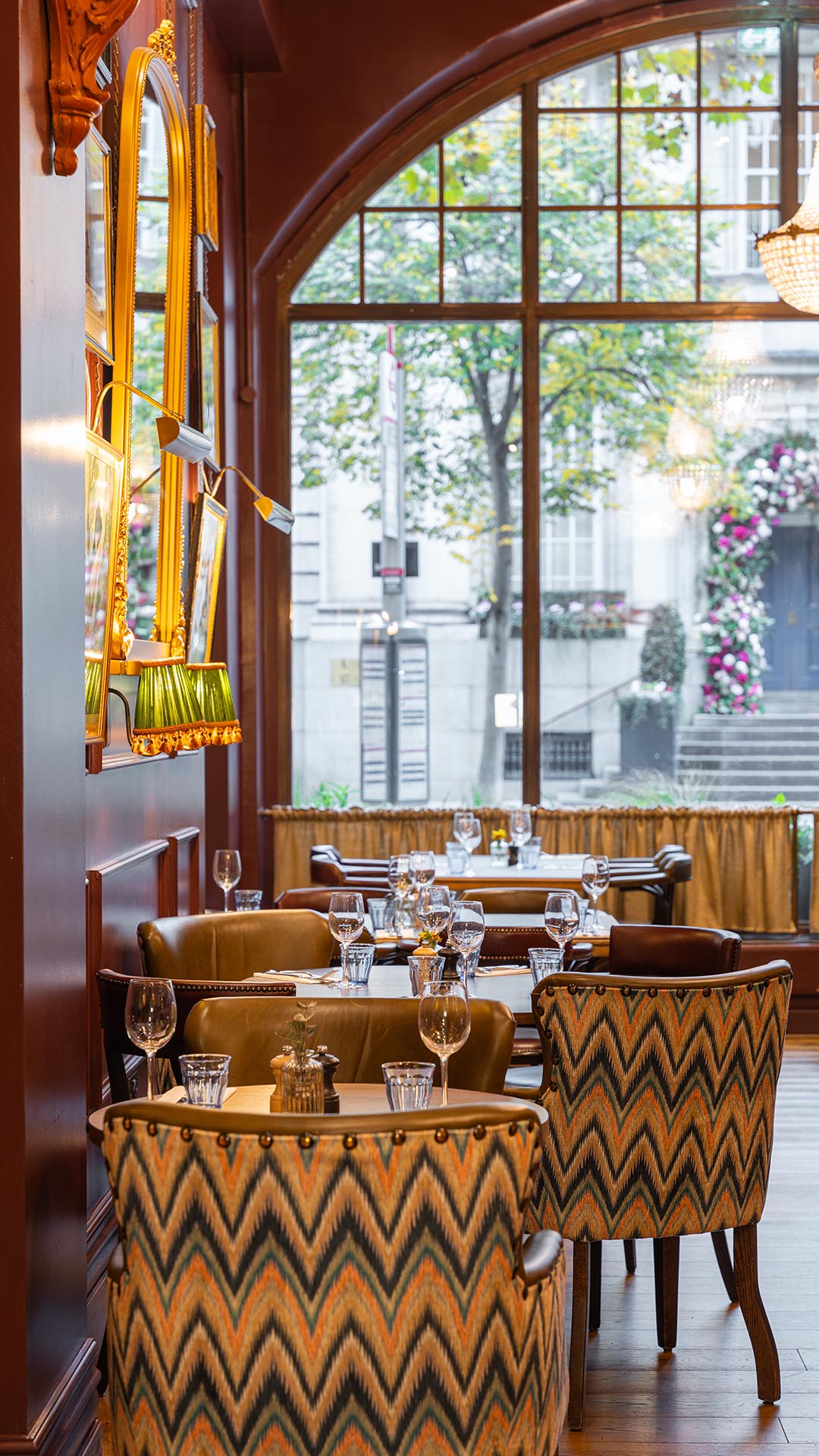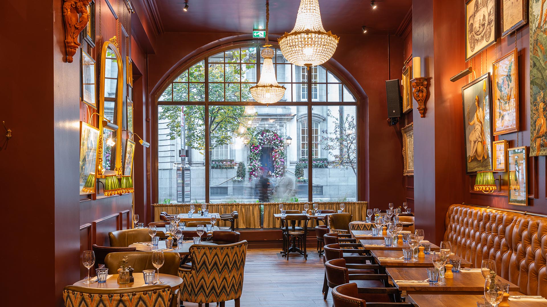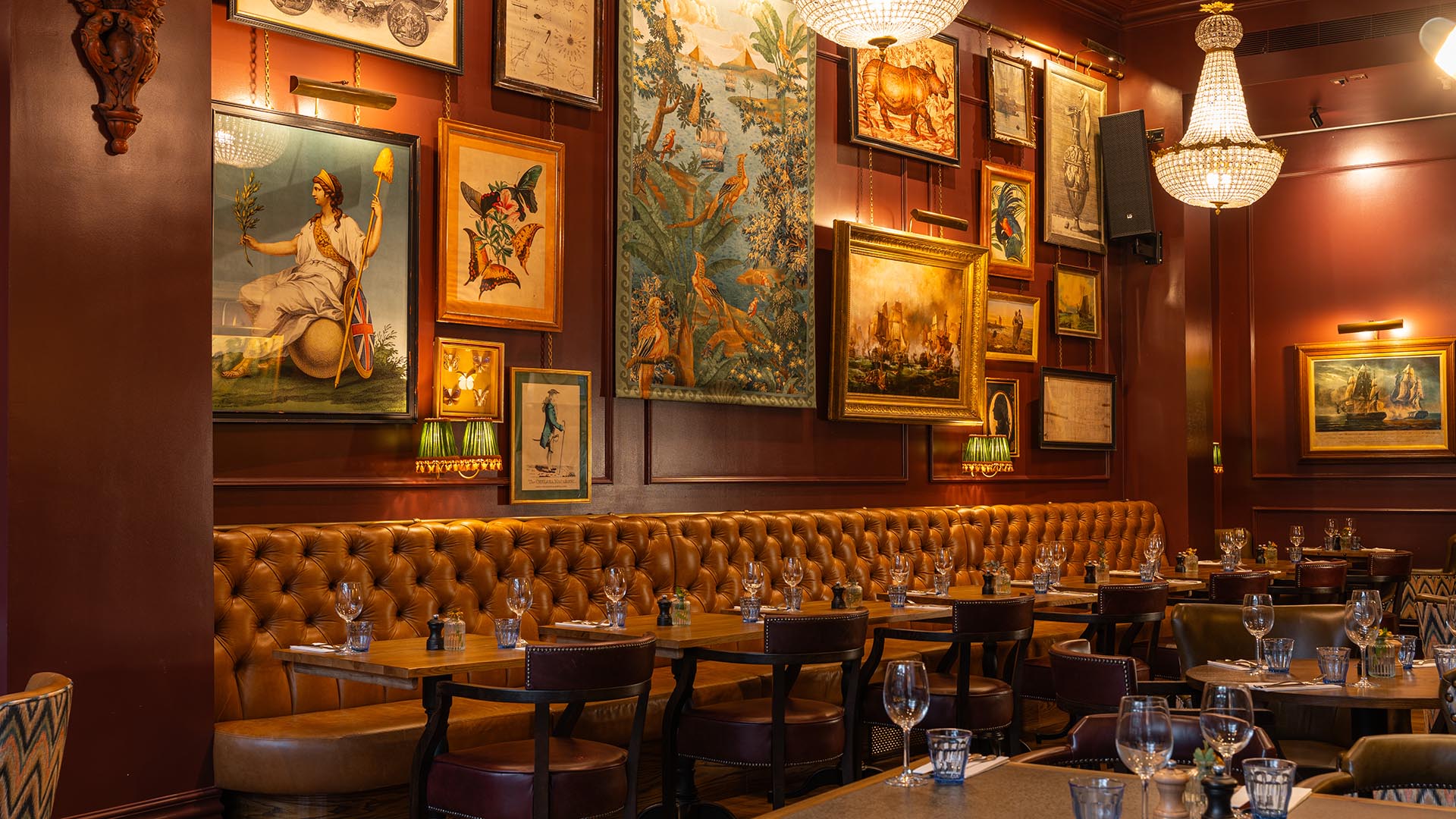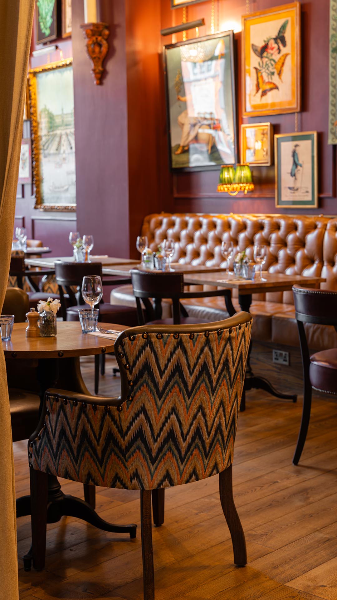Next to the Old Banking Hall, accessed through two glazed, panelled archways, is the Dining Room, which seats up to 45 guests. Rich burgundy walls and a curated mix of vintage, contemporary and bespoke artwork and tapestries create an intimate feel. Velvet tasselled wall lights, empire chandeliers, dark wooden tables and tan leather banquette seating come together to form a characterful and welcoming space.