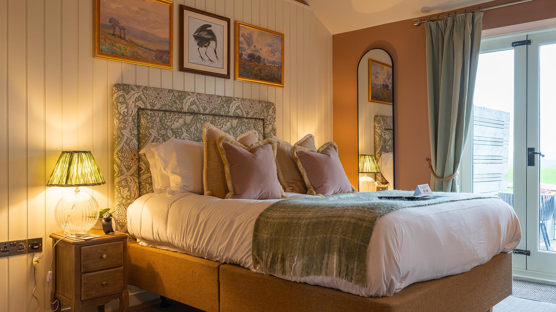 The Welldiggers Arms green patterened headboard with pink scatter cushions