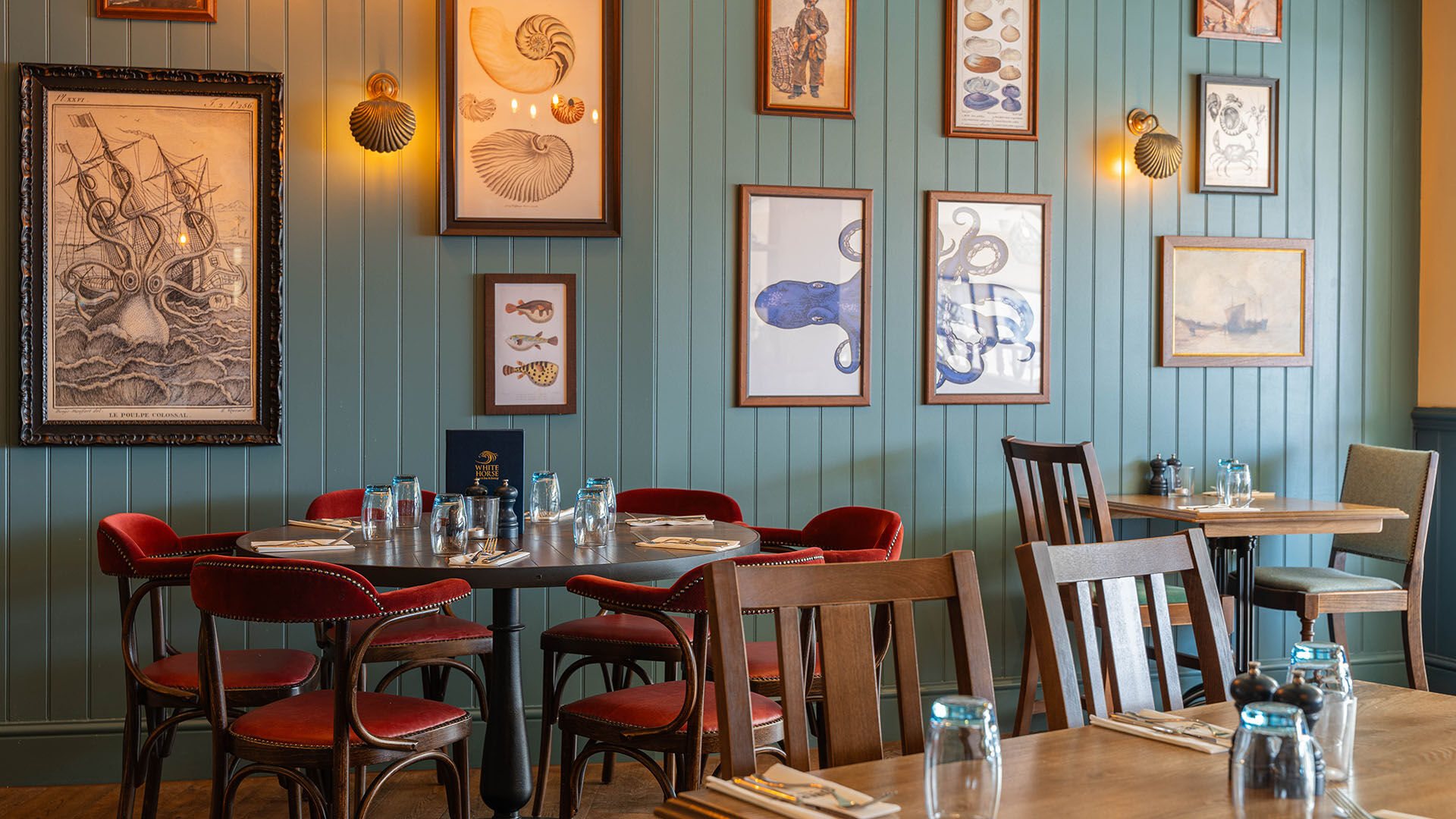 A key feature we added, was a new kitchen pass with a large sharing table for group dining and larger bookings. The upholstery colours and fabrics were chosen to elevate this seaside scheme along with the use of stipes and shell prints. Carefully chosen styling and artwork were sourced by our designers to complete the internal refurbishment.