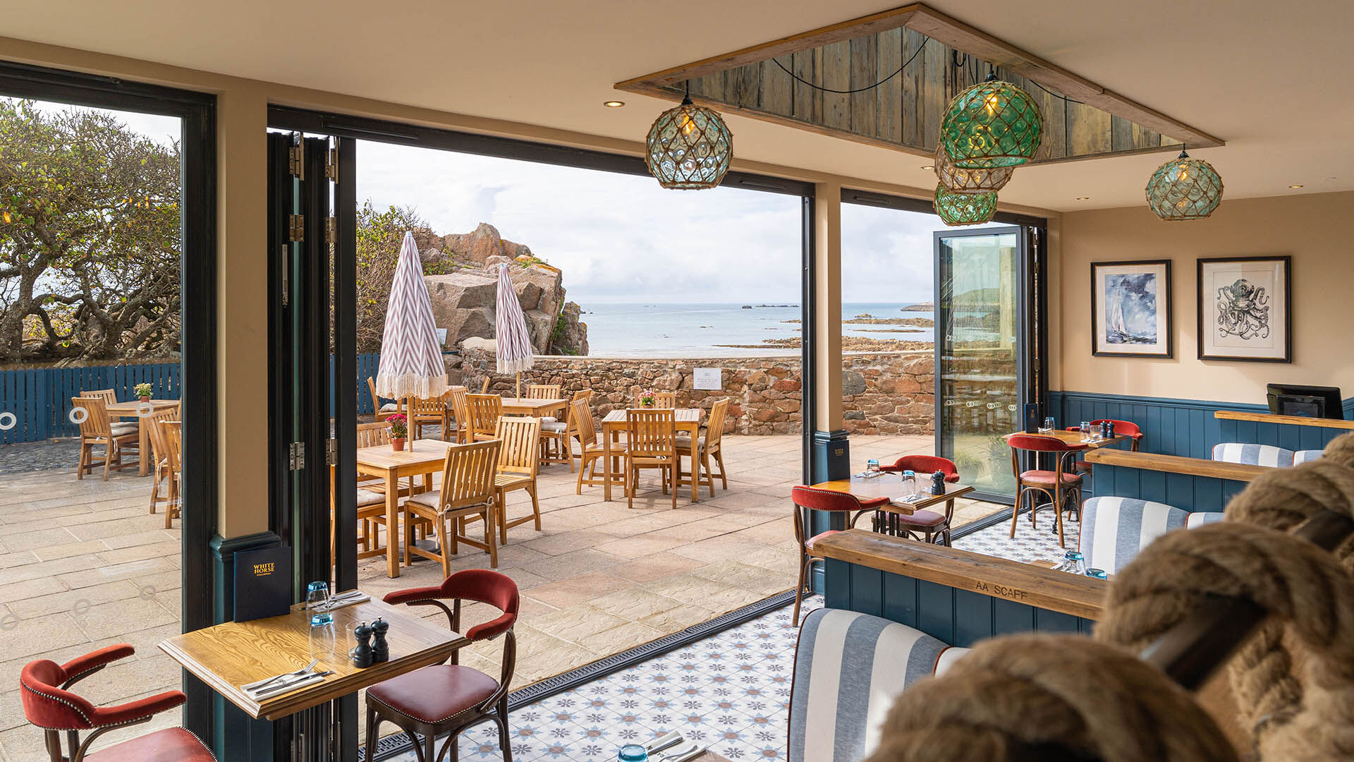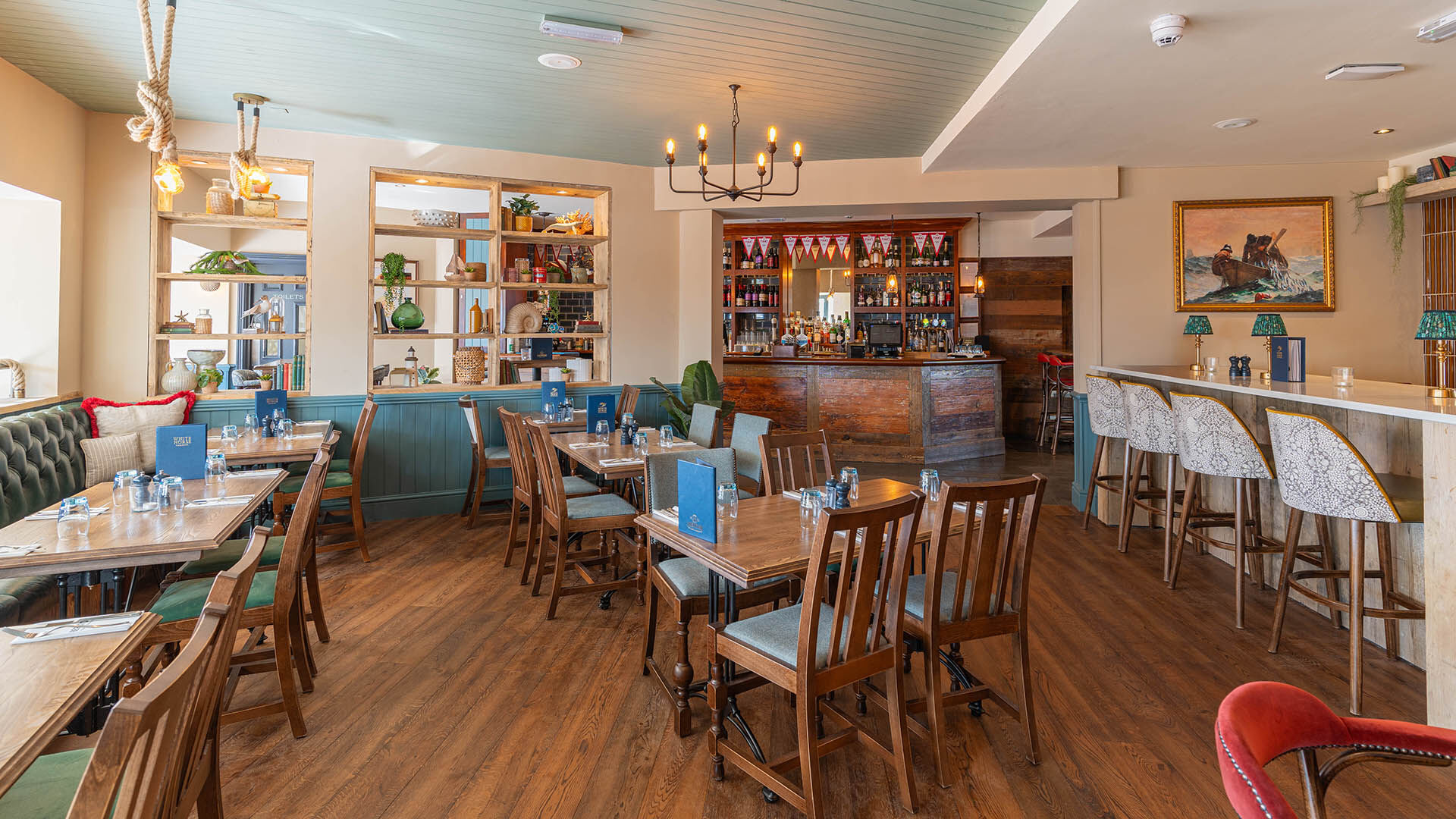 Given it's fabulous location, the pub has nautical design details throughout such as hanging glass buoys, jute rope and beach hut stripes.