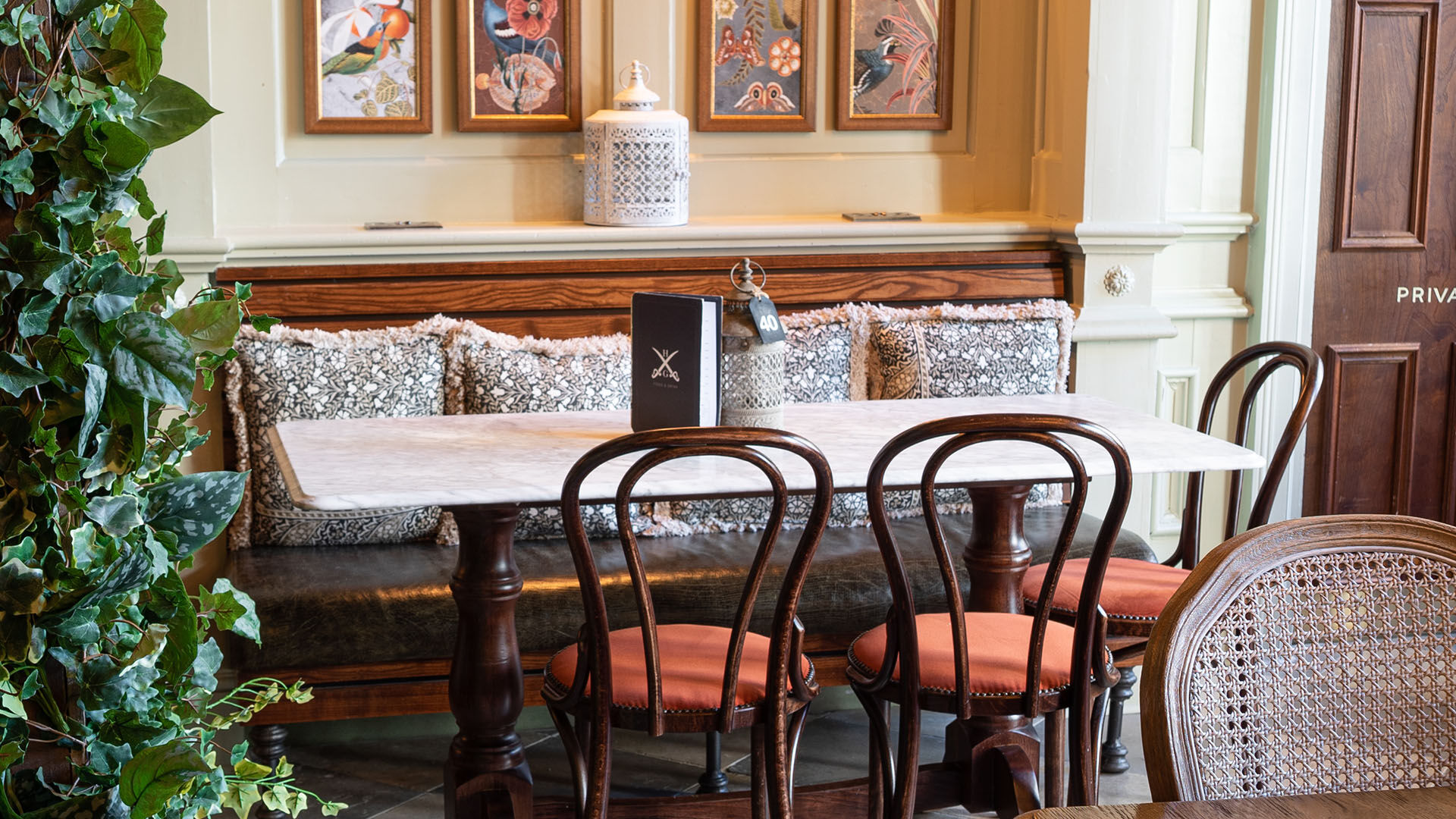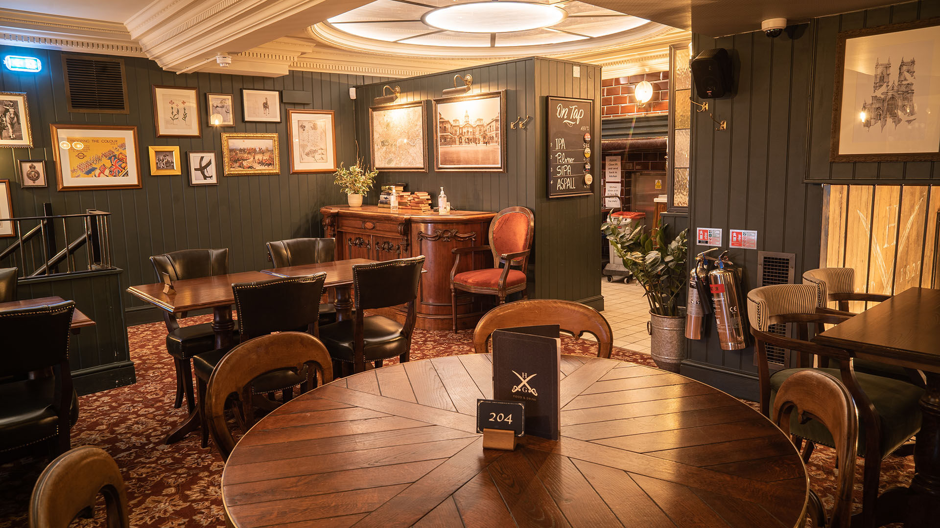 Probably one of the biggest pictures to ever hang on a pub wall is the eye-catching gilt framed painting depicting the royal cavalry charging forward in a “death or glory” scene. Other incredible decorations include sabre swords, H&G logos embossed onto furniture, atmospheric lighting coming through the ceiling joists, faux climbing plants and even saddles for guests to use for seating.